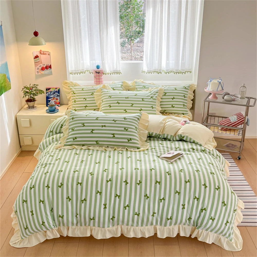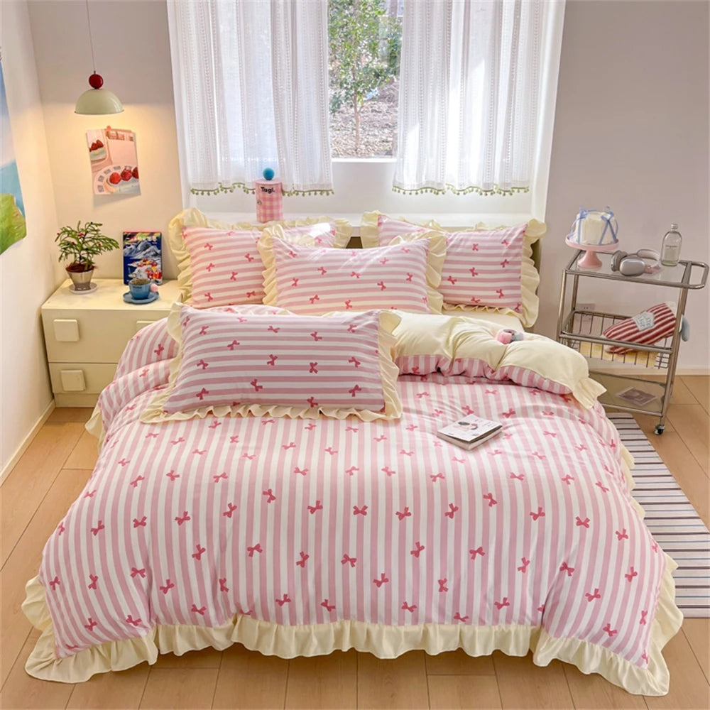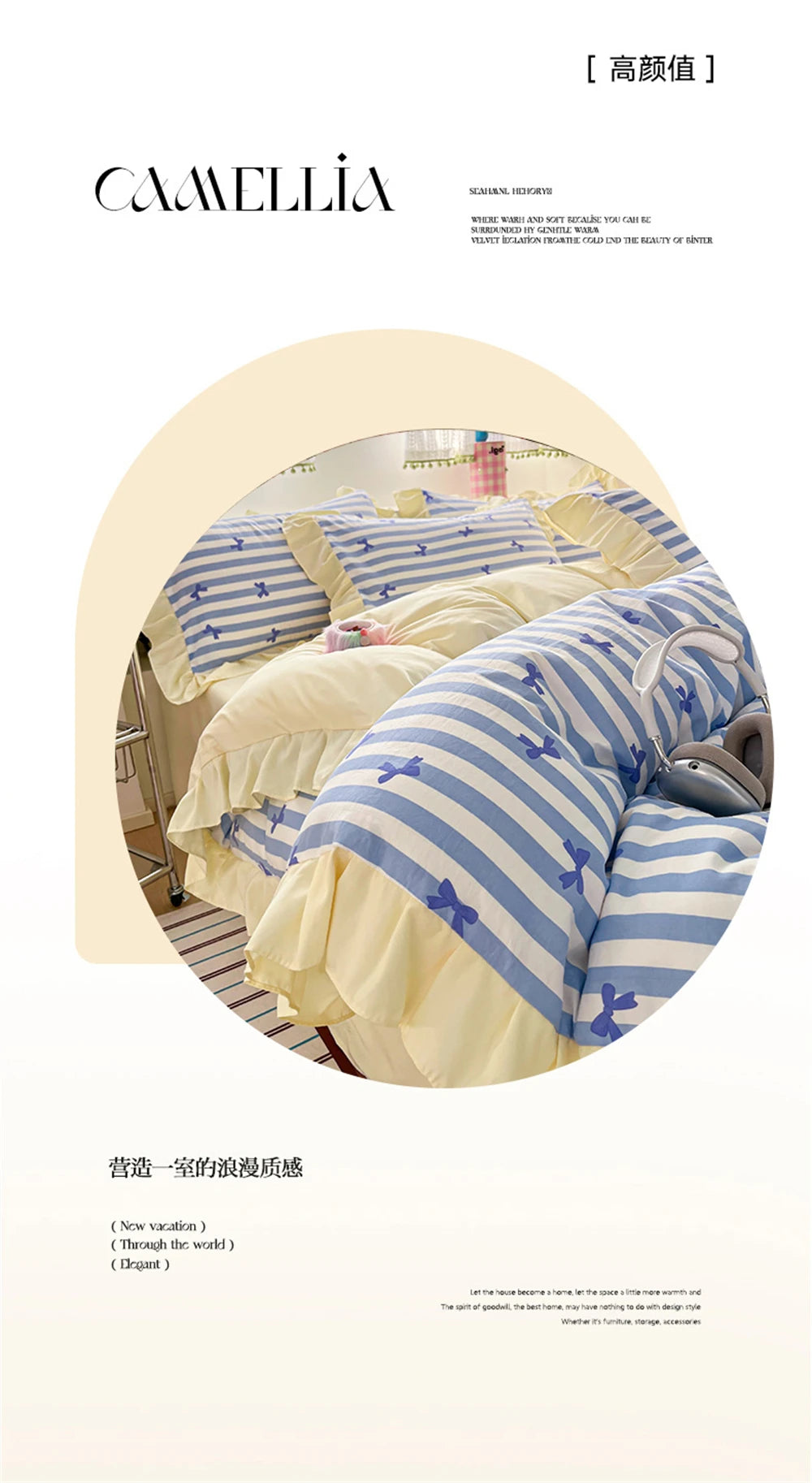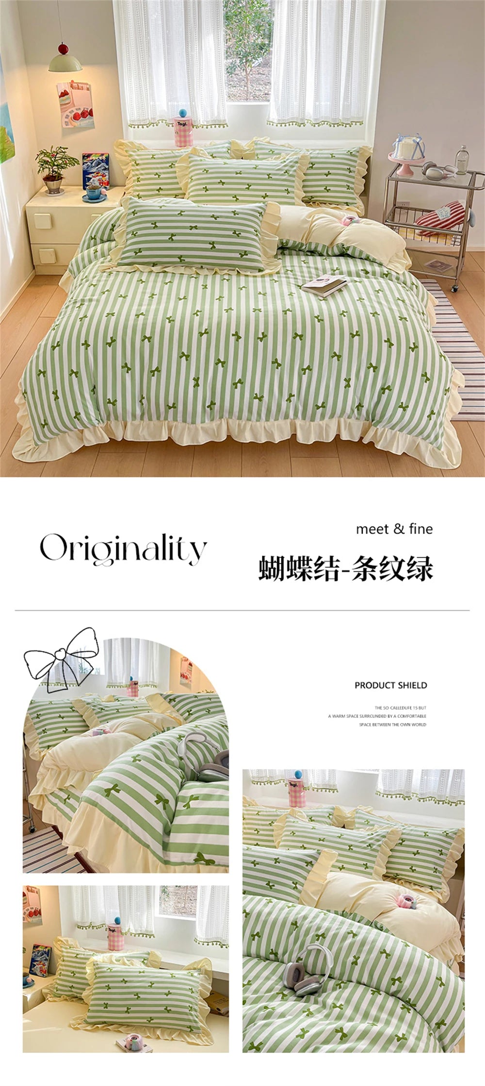 Black Lace Ruffles Korean Bow Decor Bedding Set Duvet Cover Pillowcase Washed Cotton Four-Piece Sets Soft Quilt Cover Bed Sheet