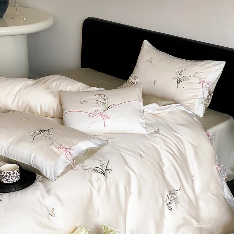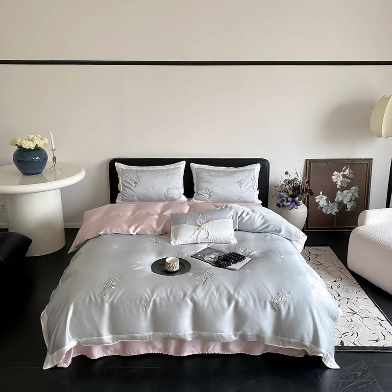 Chinese Style Orchid Embroidery Luxury Bedding Set 800TC Lyocell Silky Cooling Duvet Cover Flat/Fitted Bed Sheet Pillowcase 4Pcs