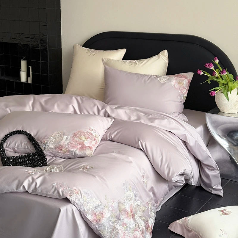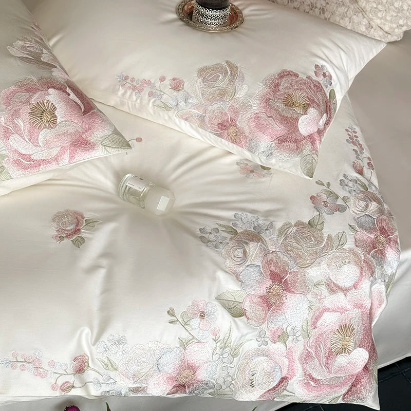 Flowers Embroidery Luxury Bedding Set Egyptian Cotton Single Queen King Size Duvet Cover Flat/Fitted Bed Sheet Pillowcases 3/4Pc