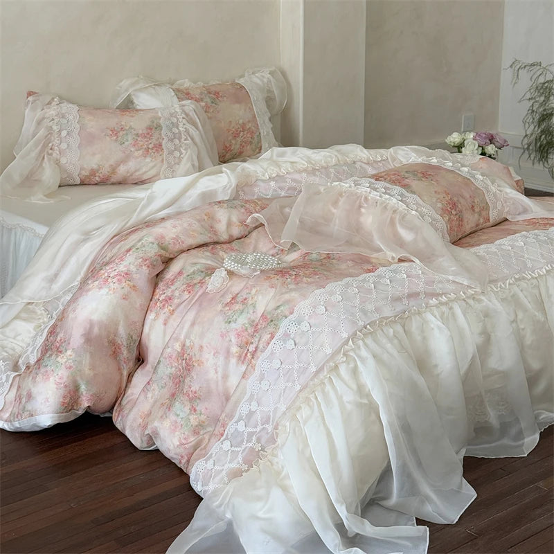 Flowers Print Lace Ruffles Princess Bedding Set Lyocell Soft Silky Duvet Cover Bed Sheet/Bed Skirt/Fitted Sheet Pillowcases 4Pcs