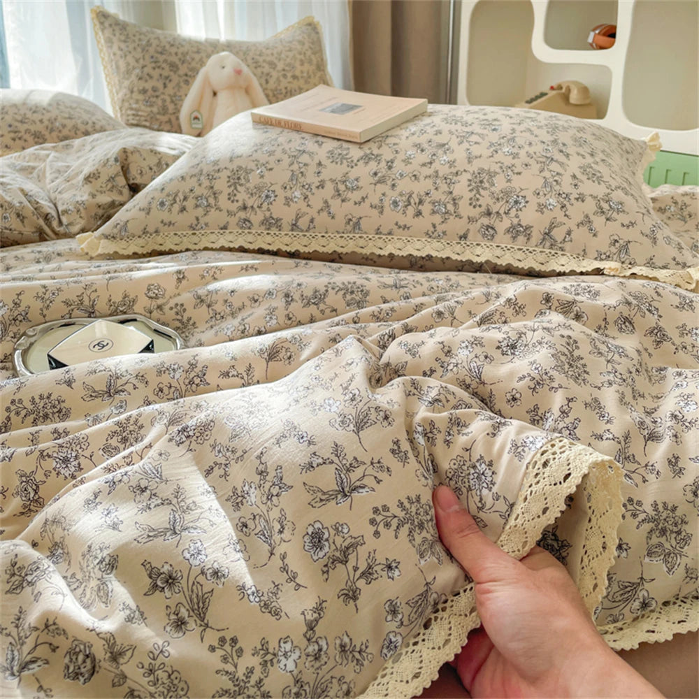 INS Girls Cherry Soft Bedding Set Washed Cotton Bed Sheet Queen King Size Duvet Set Flower Comforter Set Pillowcase Bed Linens