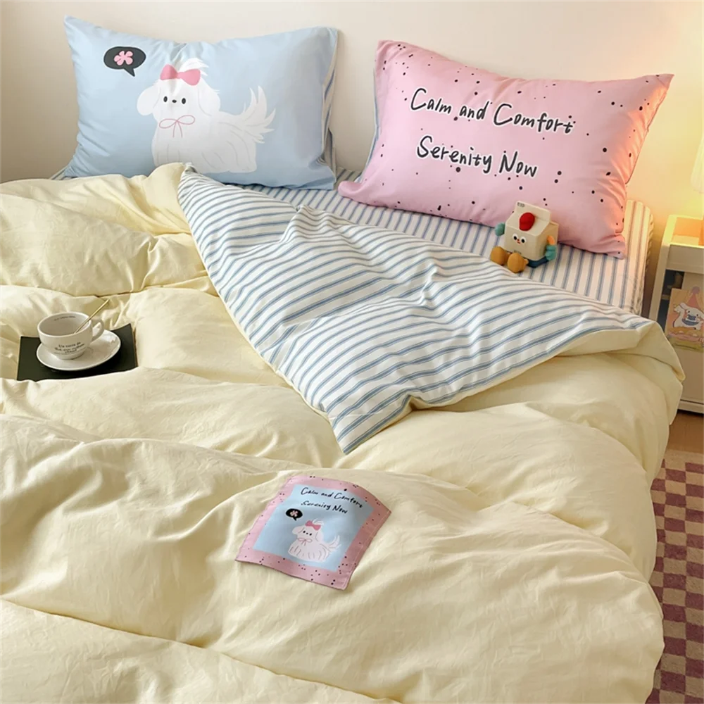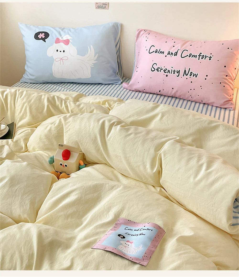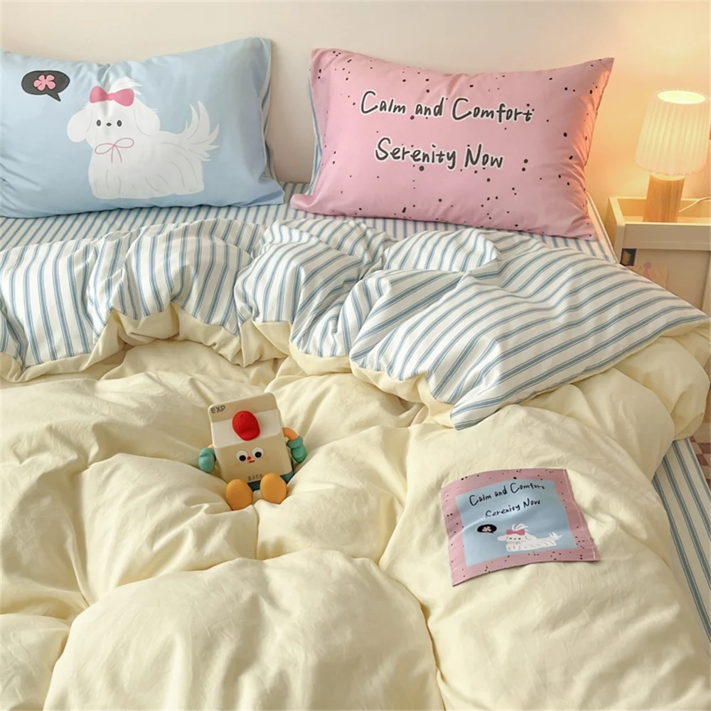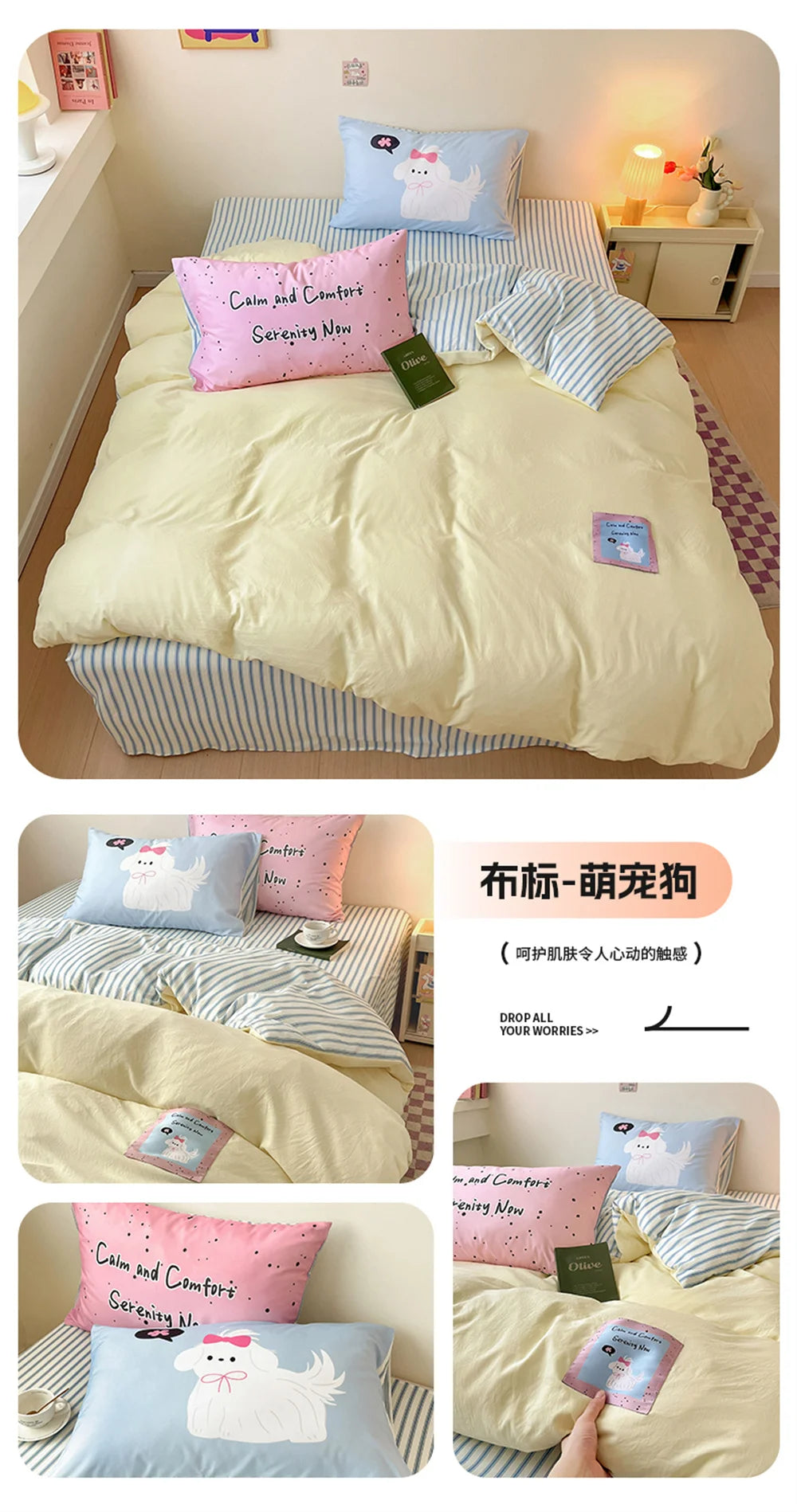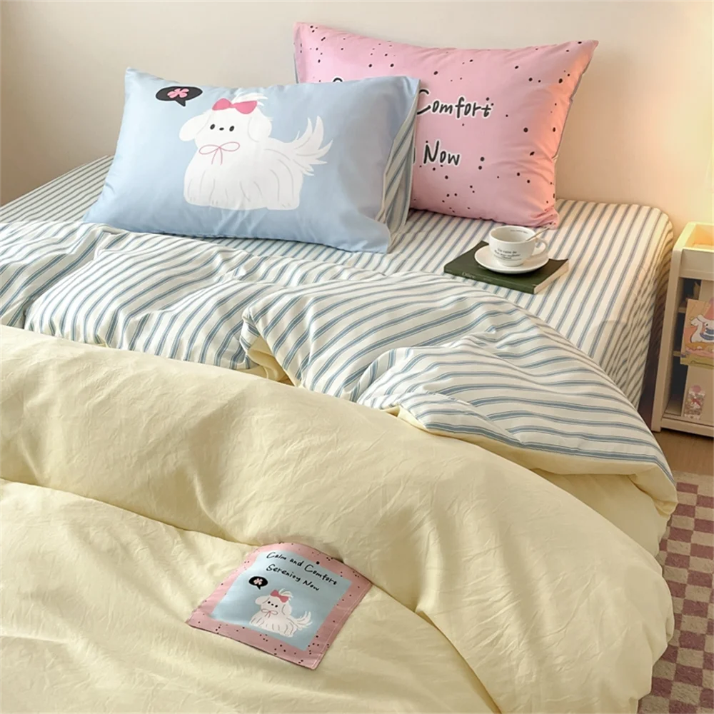 Kawaii Cartoon Dog Washed Cotton Bedding Set for Girl Boys Skin-friendly Duvet Cover Set with Sheet Soft Comfortable Quilt Cover