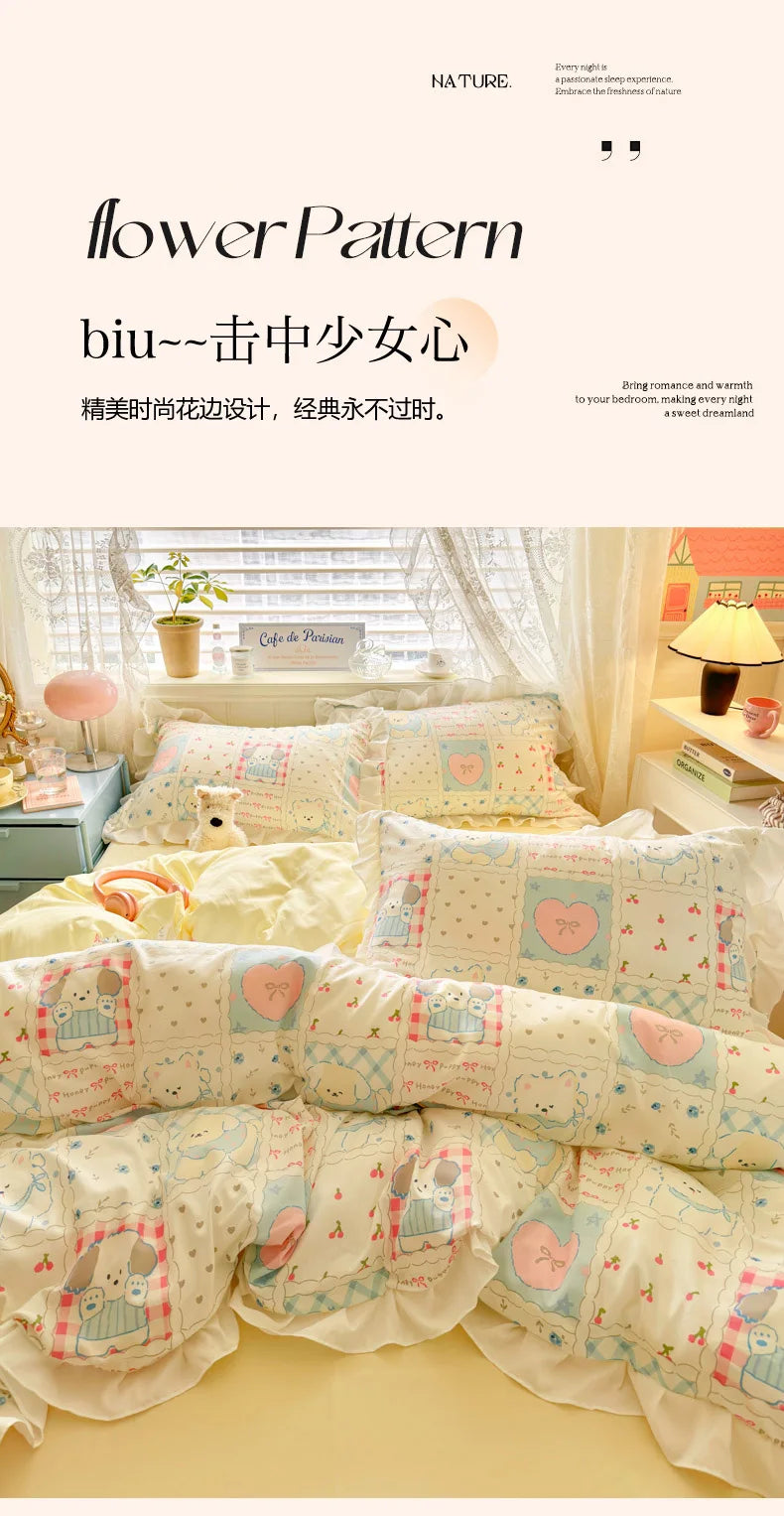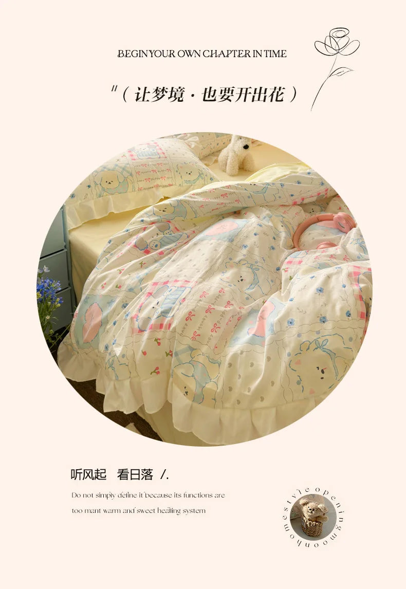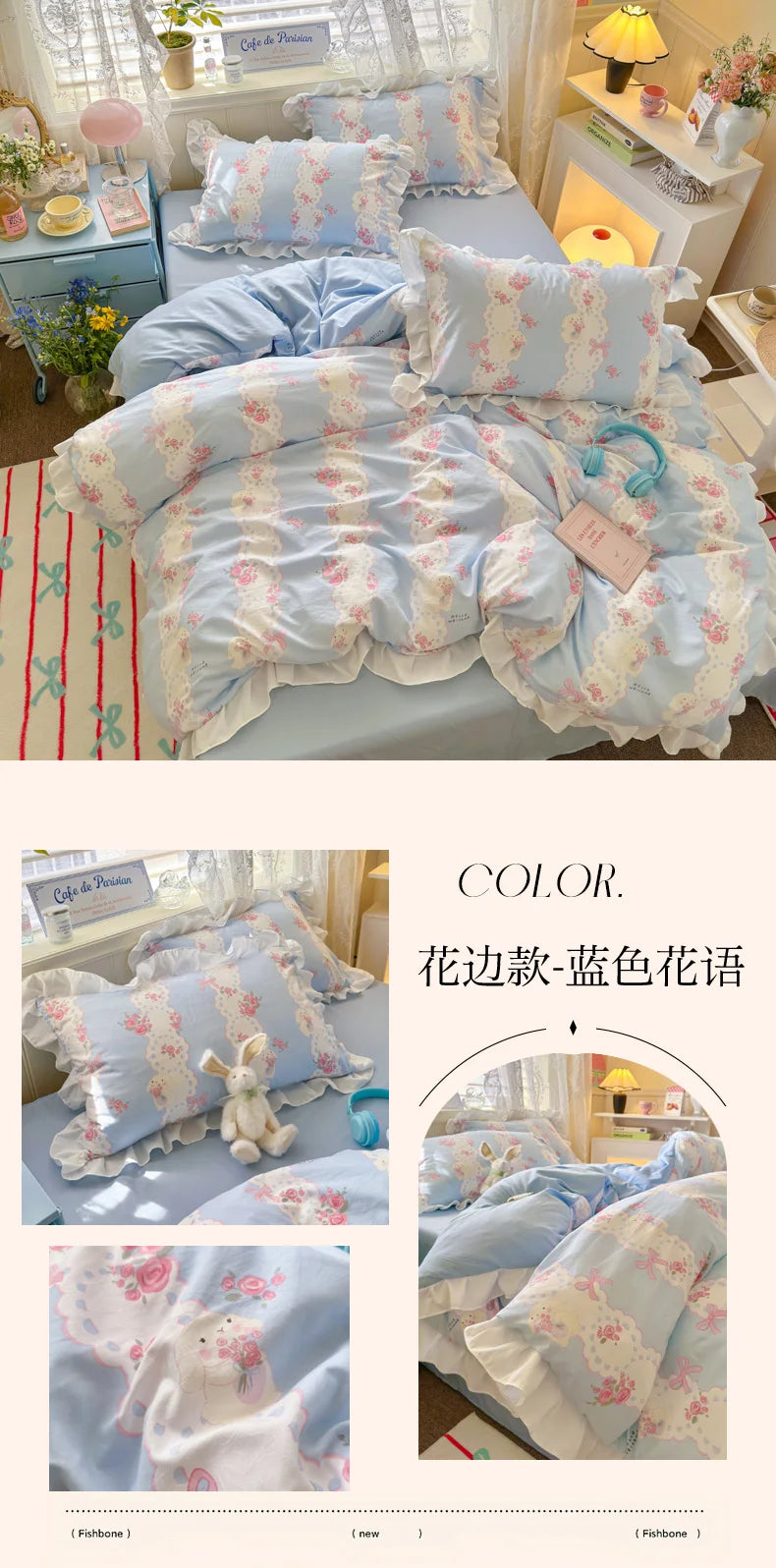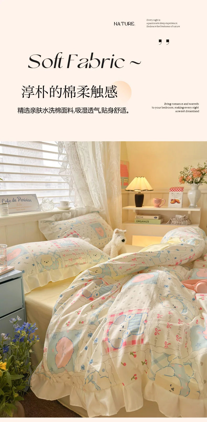 Korean Princess Style 4Pcs Floral Ruffles Bedding Set Single Queen Size Soft Skin-friendly Washed Cotton Duvet Cover Pillowcase