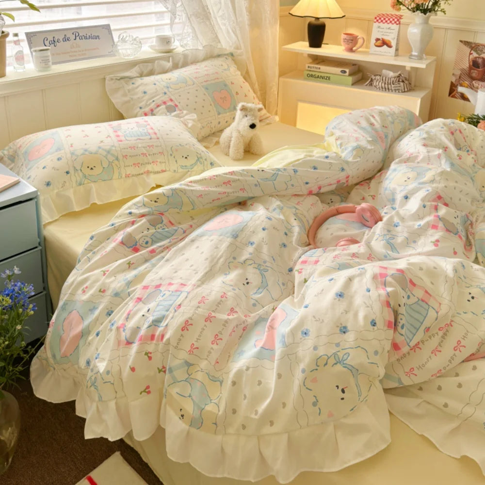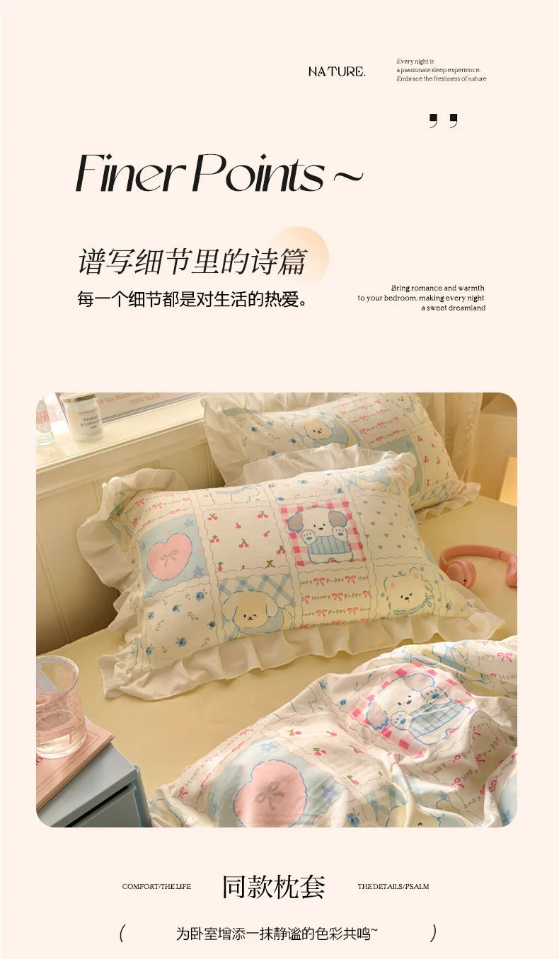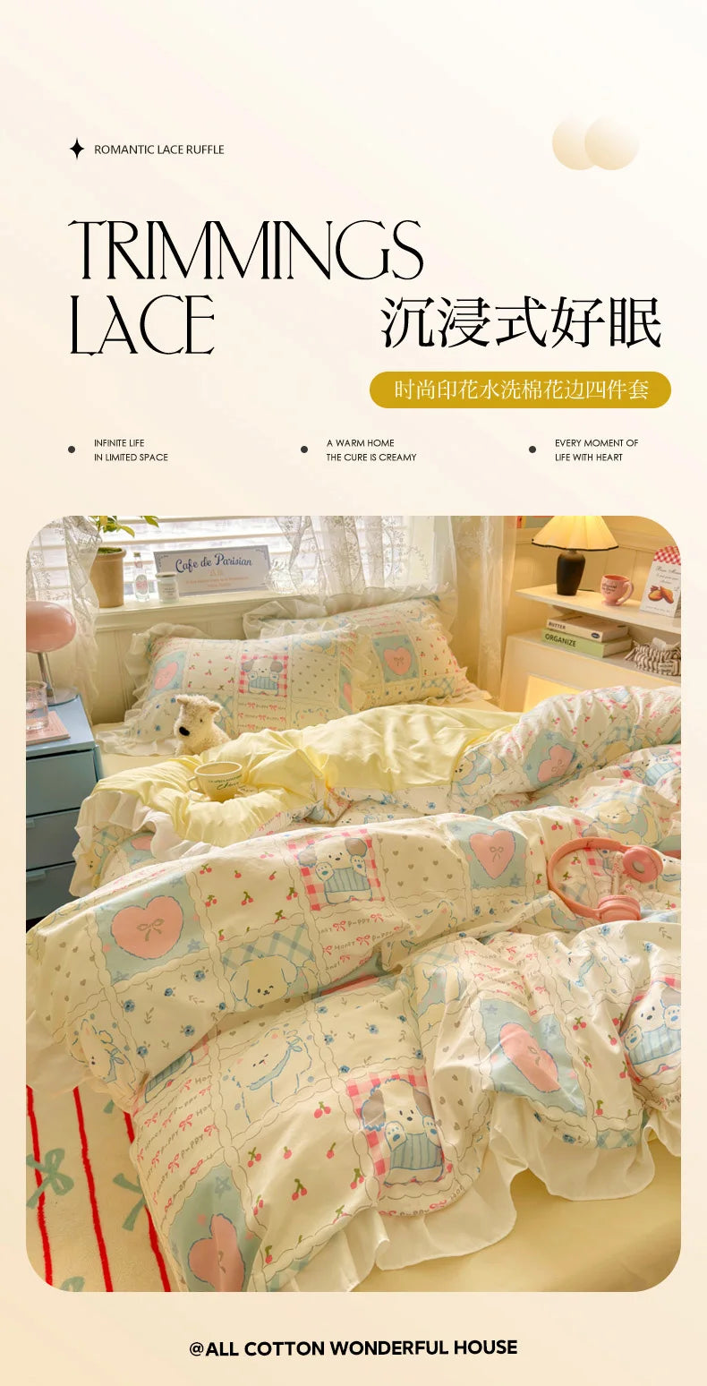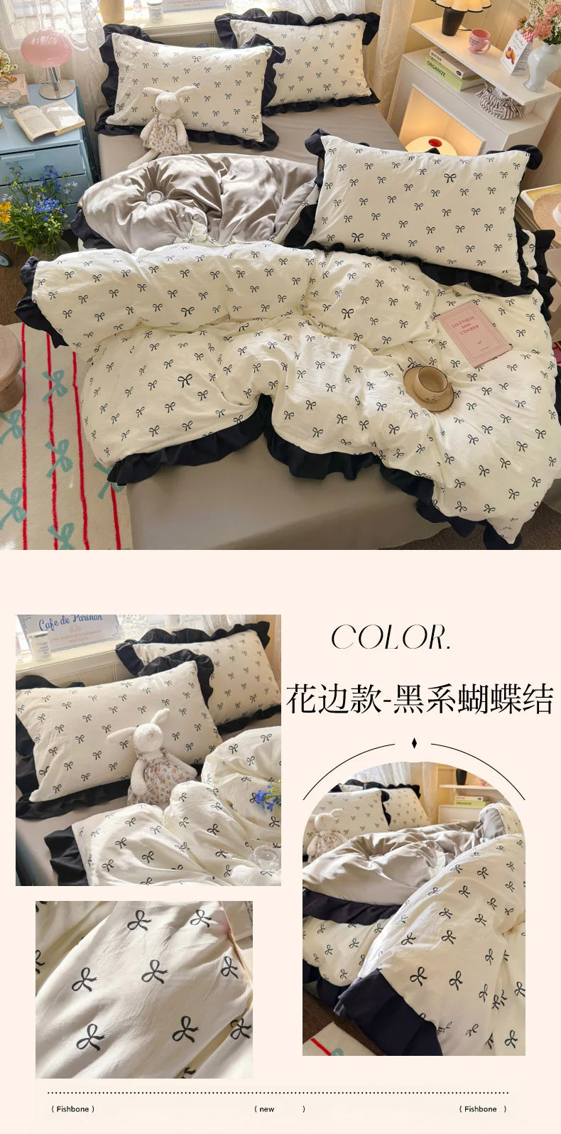 Korean Princess Style 4Pcs Floral Ruffles Bedding Set Single Queen Size Soft Skin-friendly Washed Cotton Duvet Cover Pillowcase