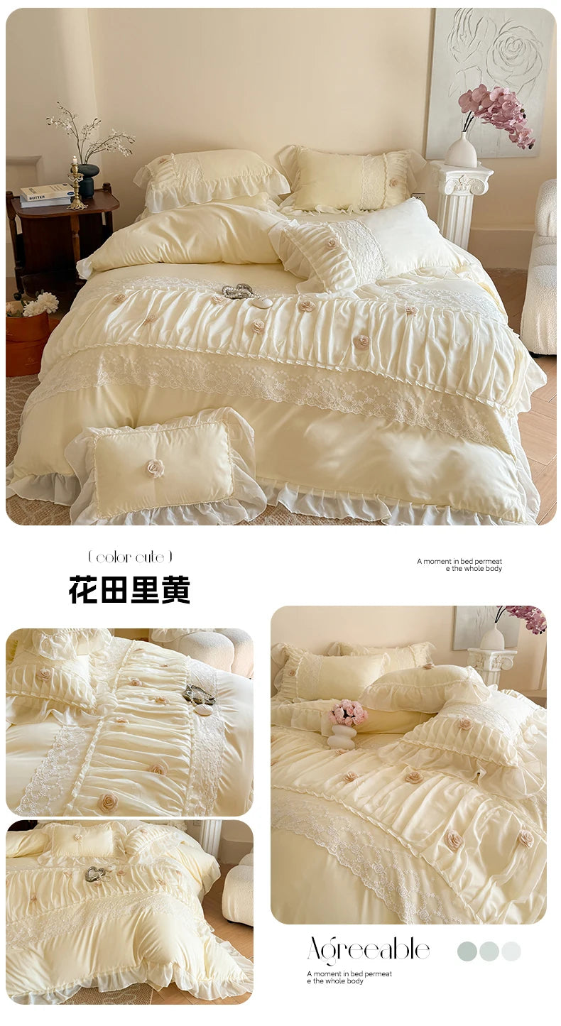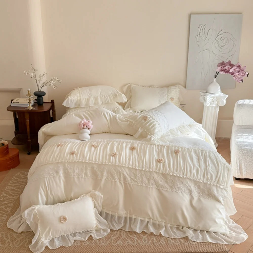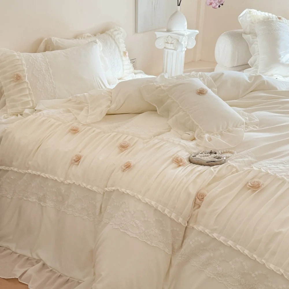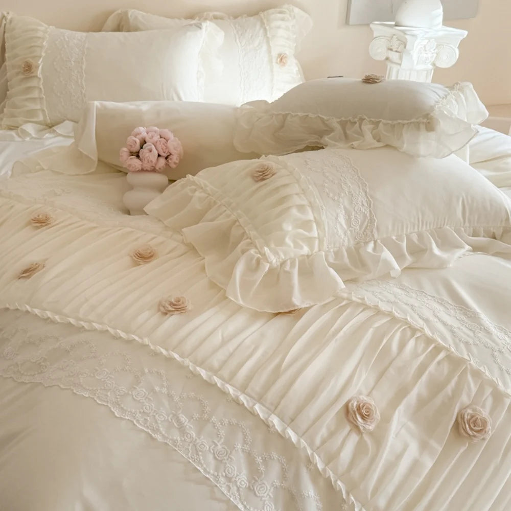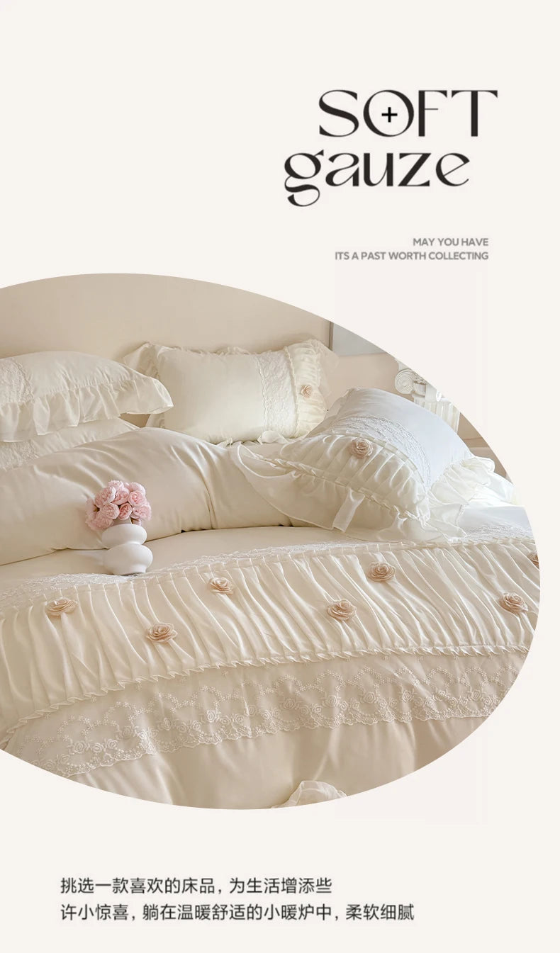 Korean Princess Style Lace Ruffles Wedding Bedding Set Soft Rose Flowers Four-Piece Set Duvet Cover Bed Sheet Pillowcase 4Pcs