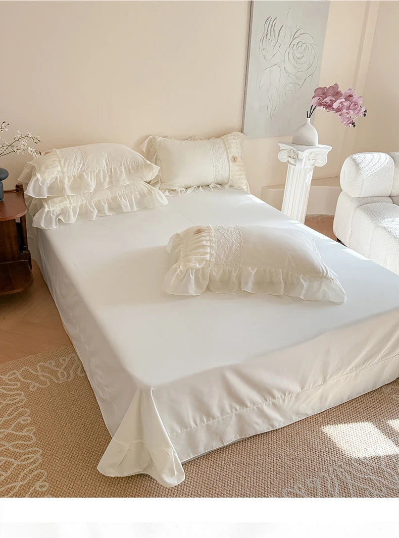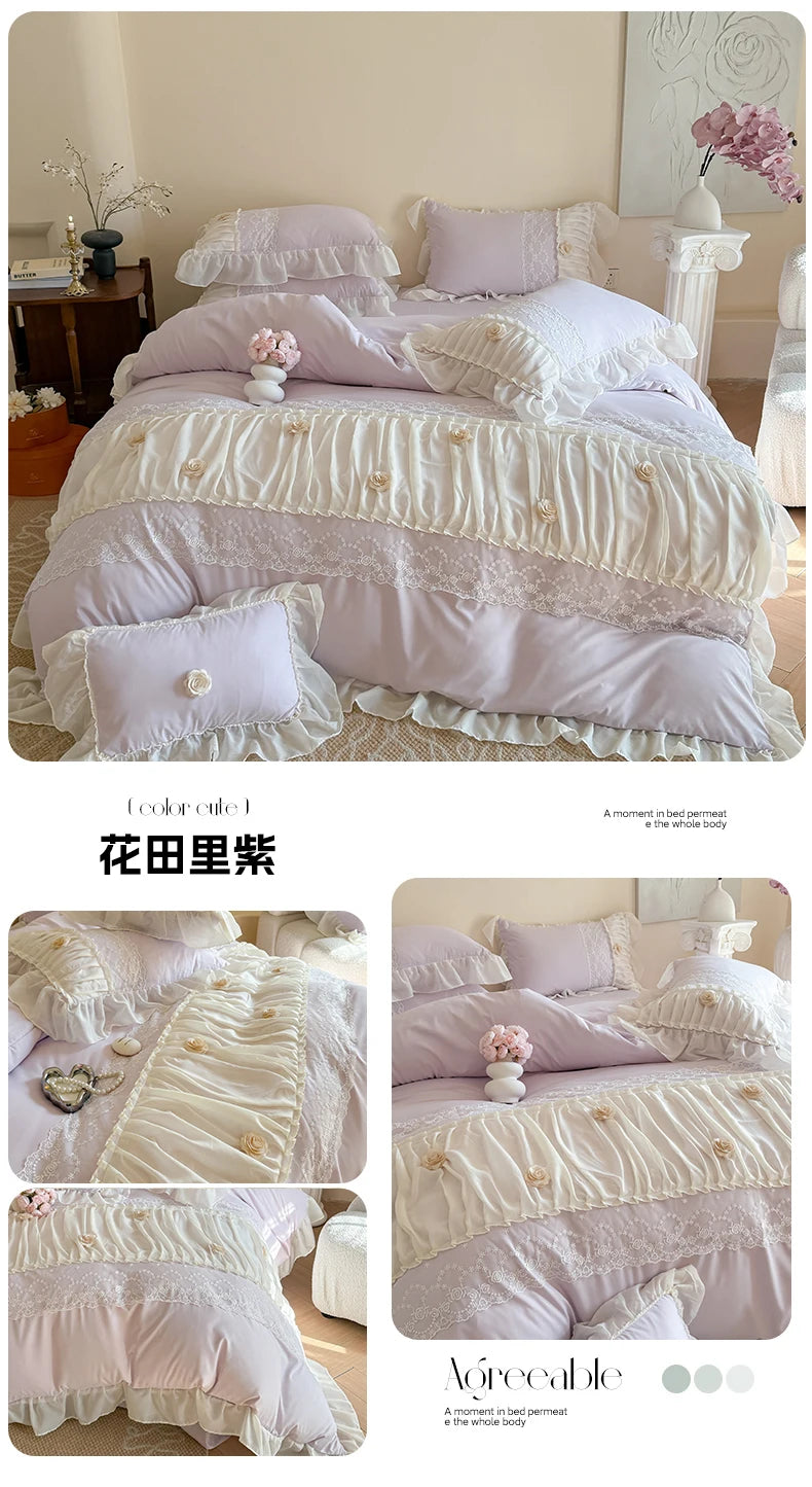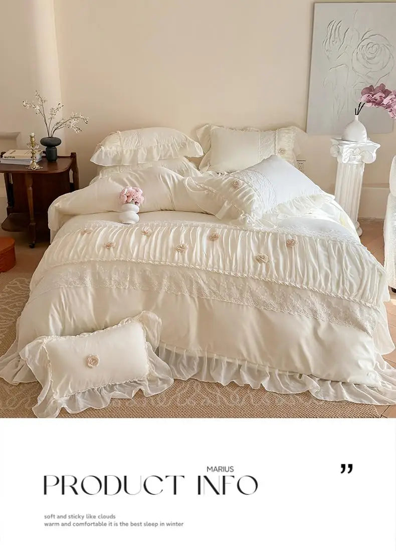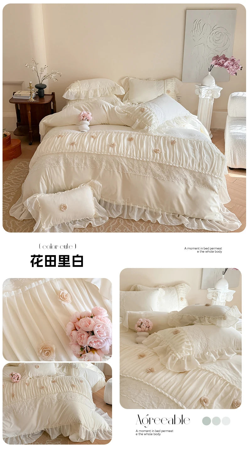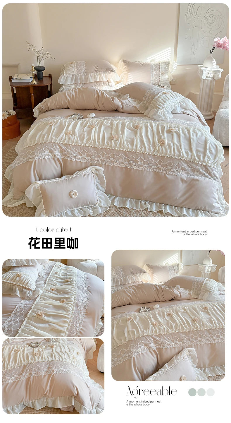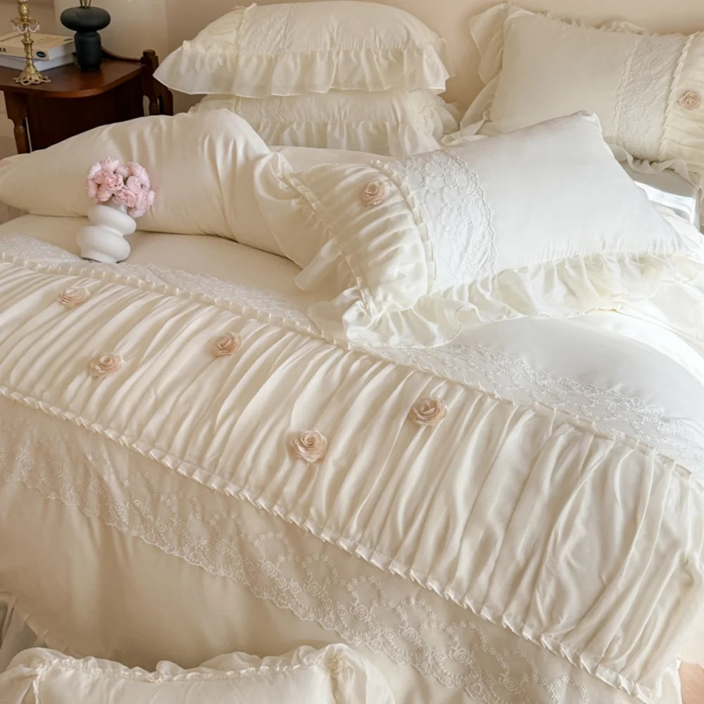 Korean Princess Style Lace Ruffles Wedding Bedding Set Soft Rose Flowers Four-Piece Set Duvet Cover Bed Sheet Pillowcase 4Pcs