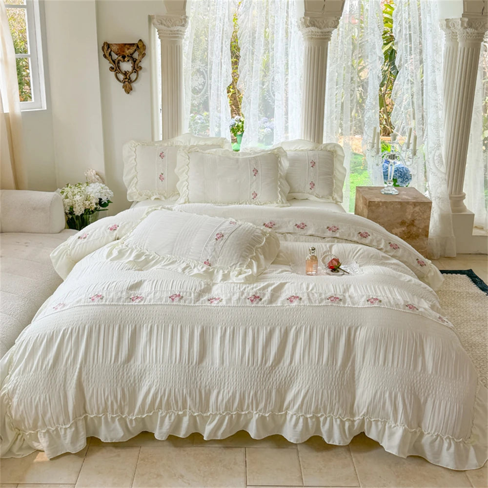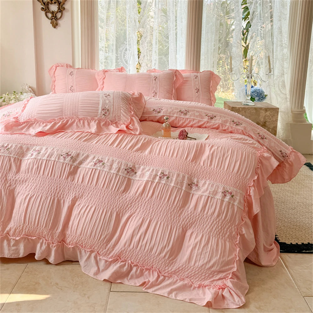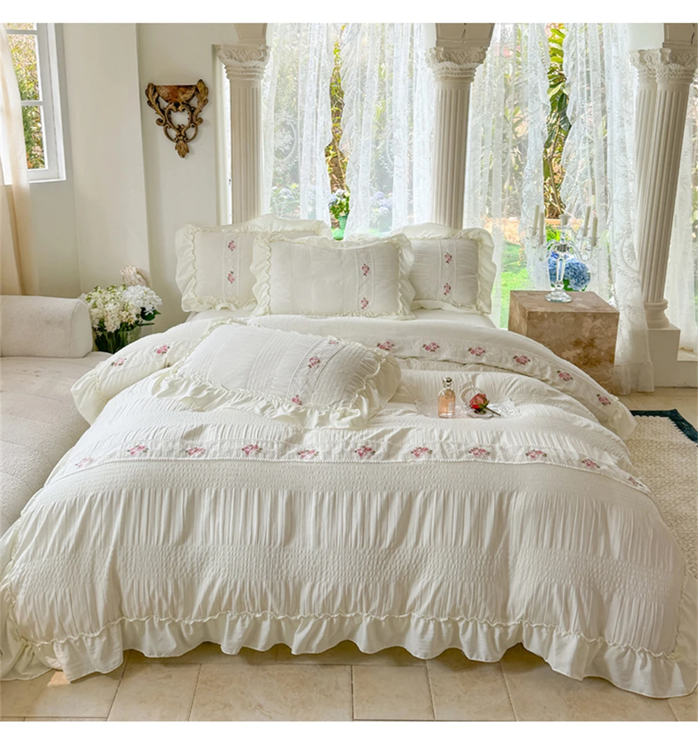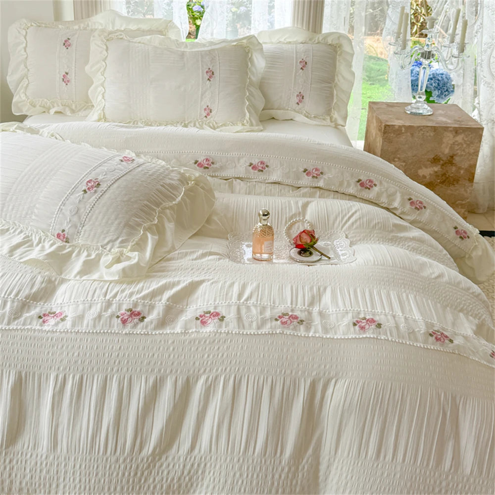 Korean Style Bed Set Seersucker Flower Embroidery Four Piece Set With Lace Bed Flat Sheet Pillowcase Duvet Cover Set Textiles