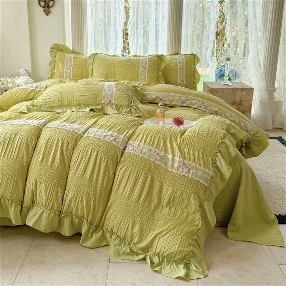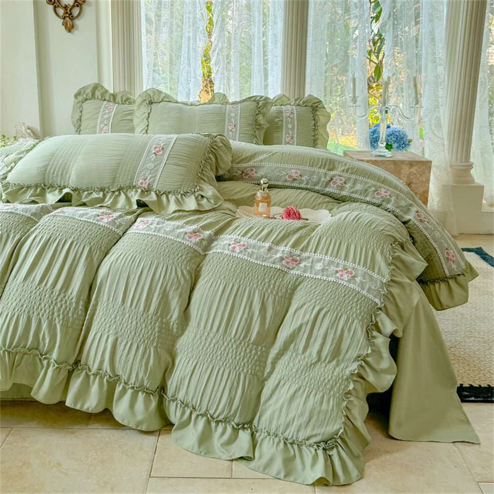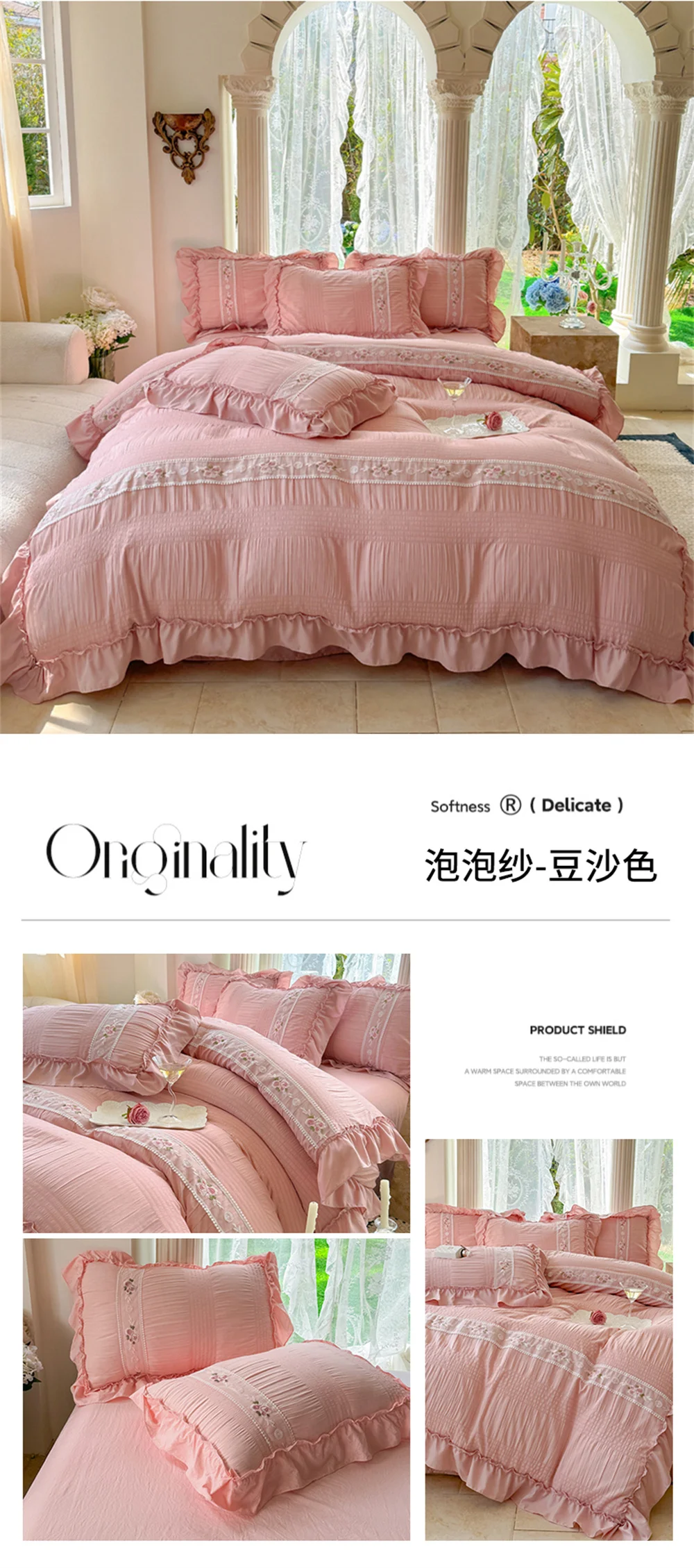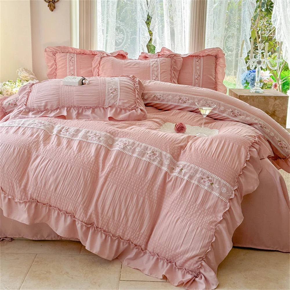 Korean Style Bed Set Seersucker Flower Embroidery Four Piece Set With Lace Bed Flat Sheet Pillowcase Duvet Cover Set Textiles