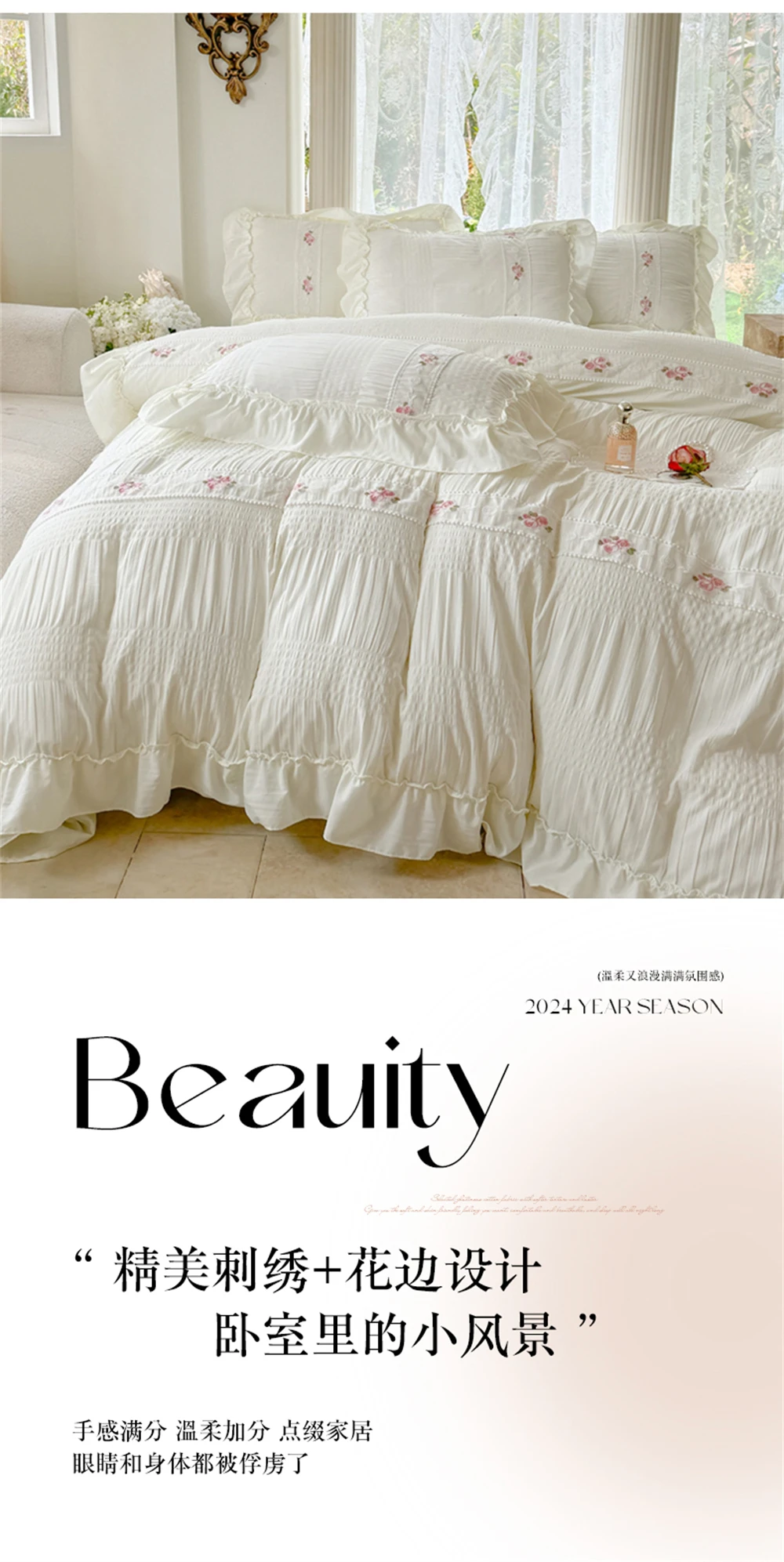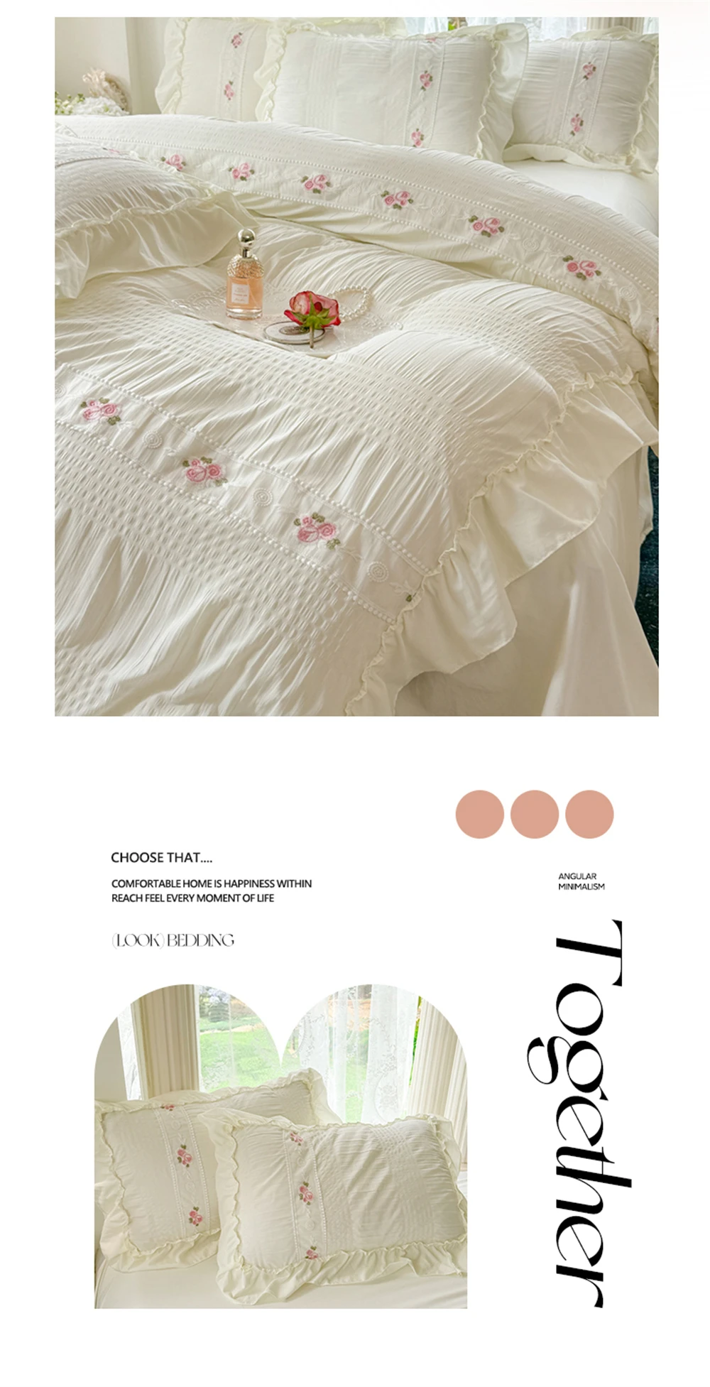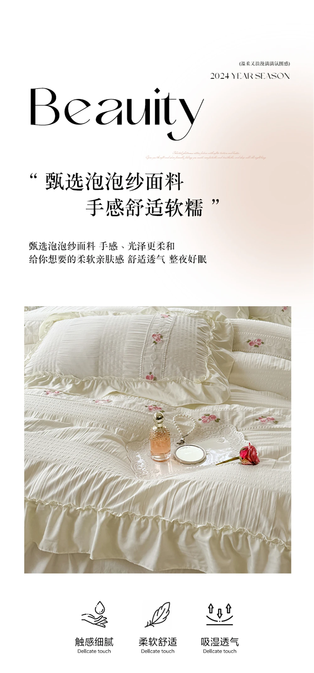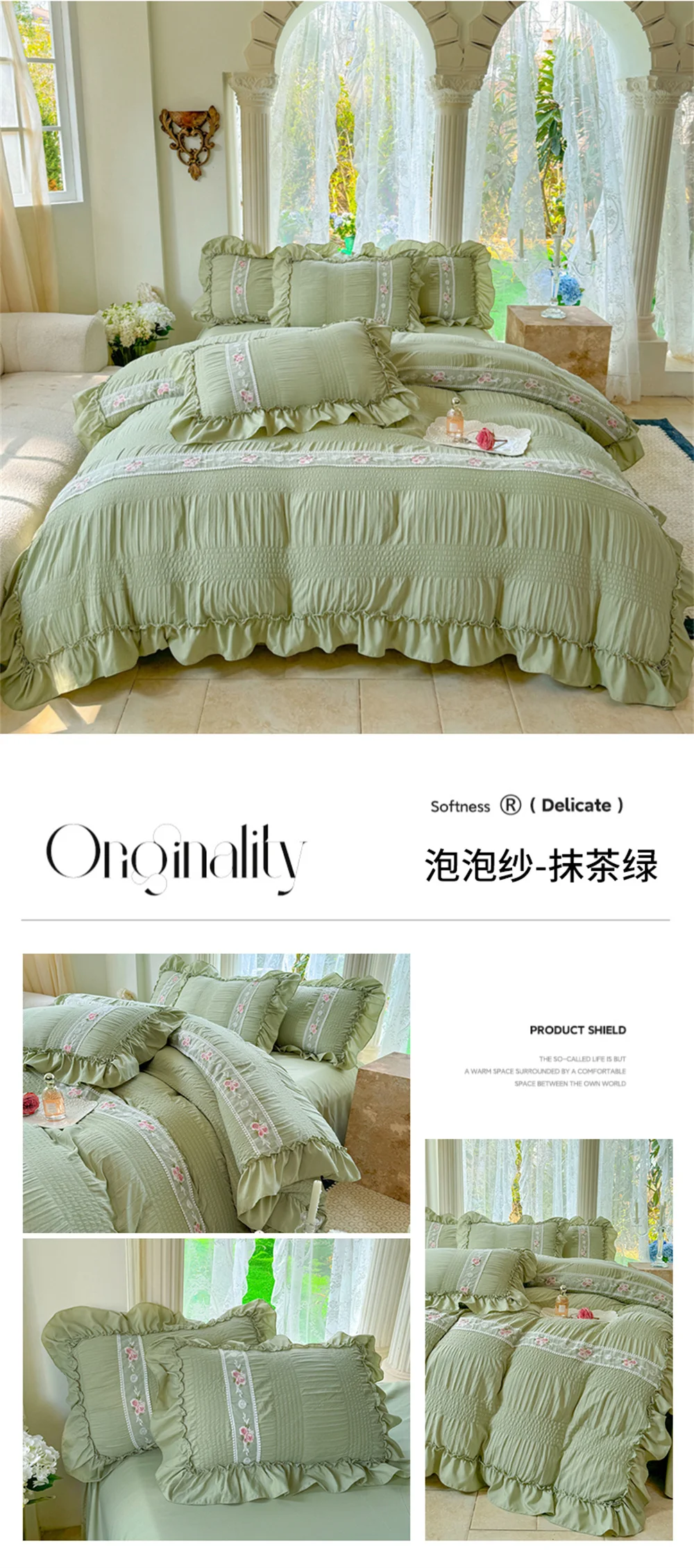 Korean Style Bed Set Seersucker Flower Embroidery Four Piece Set With Lace Bed Flat Sheet Pillowcase Duvet Cover Set Textiles