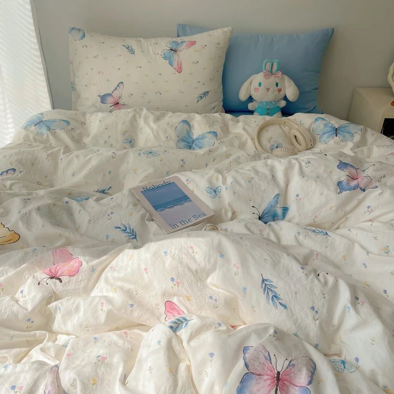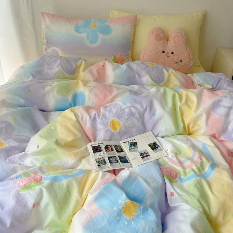 Korean Style Cute Bedding Set For Girls Bed Linen New Skin Friendly Fresh Flora Printed Washed Cotton Duvet Cover Set