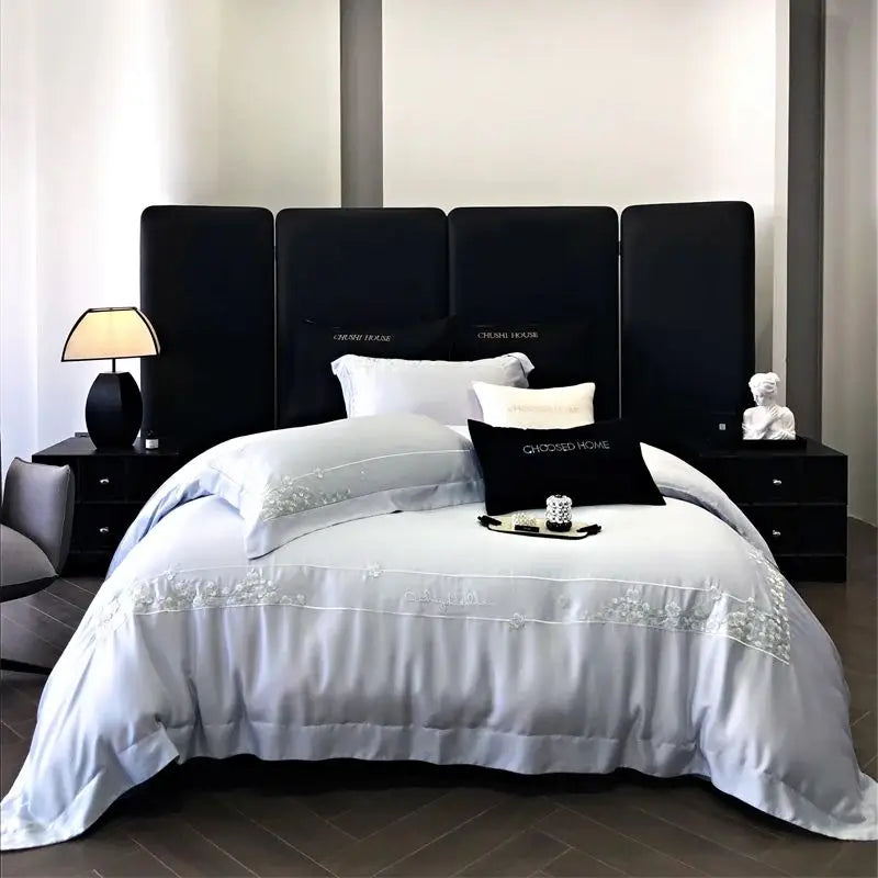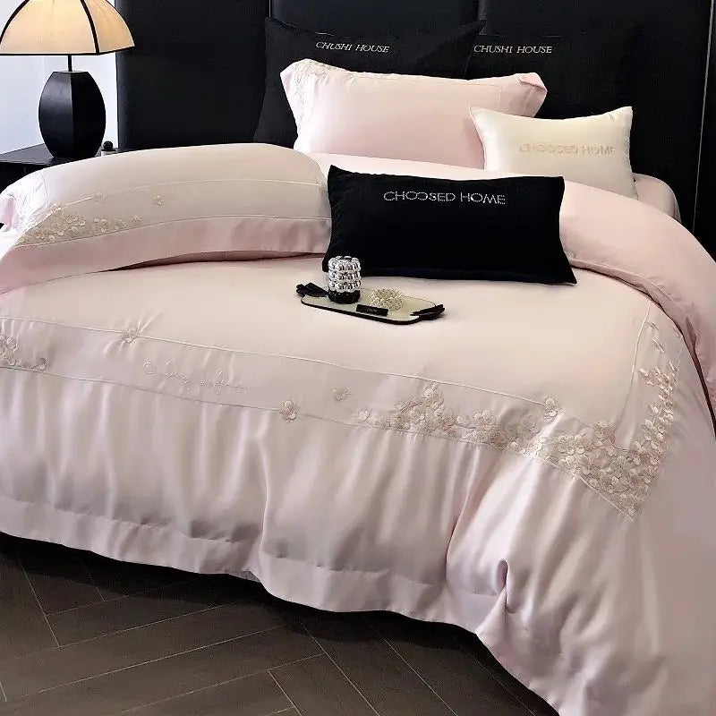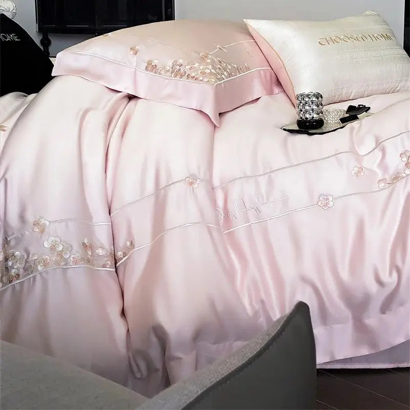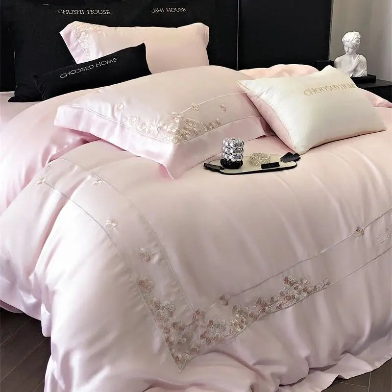 Pink Flowers Embroidery Bedding Set Lyocell Bamboo Fiber Soft Silky Cool Feeling Duvet Cover Flat/Fitted Bed Sheet Pillowcases