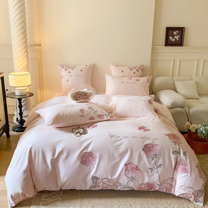 Pink Vintage Rose Flowers Embroidery 100% Cotton Bedding Set Single Queen King Duvet Cover Bed Sheet/Fitted Sheet Pillowcases