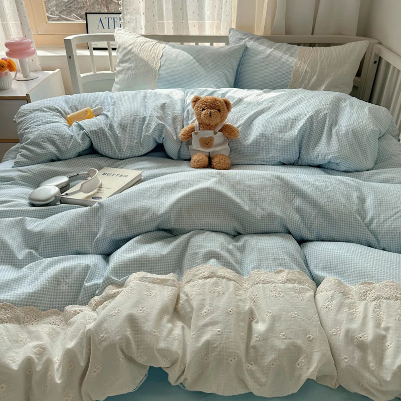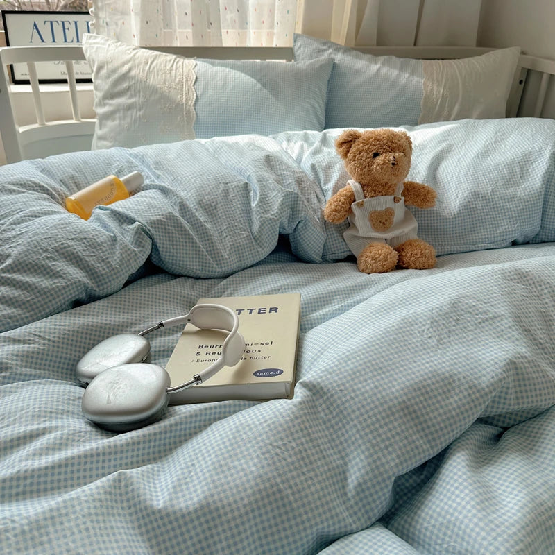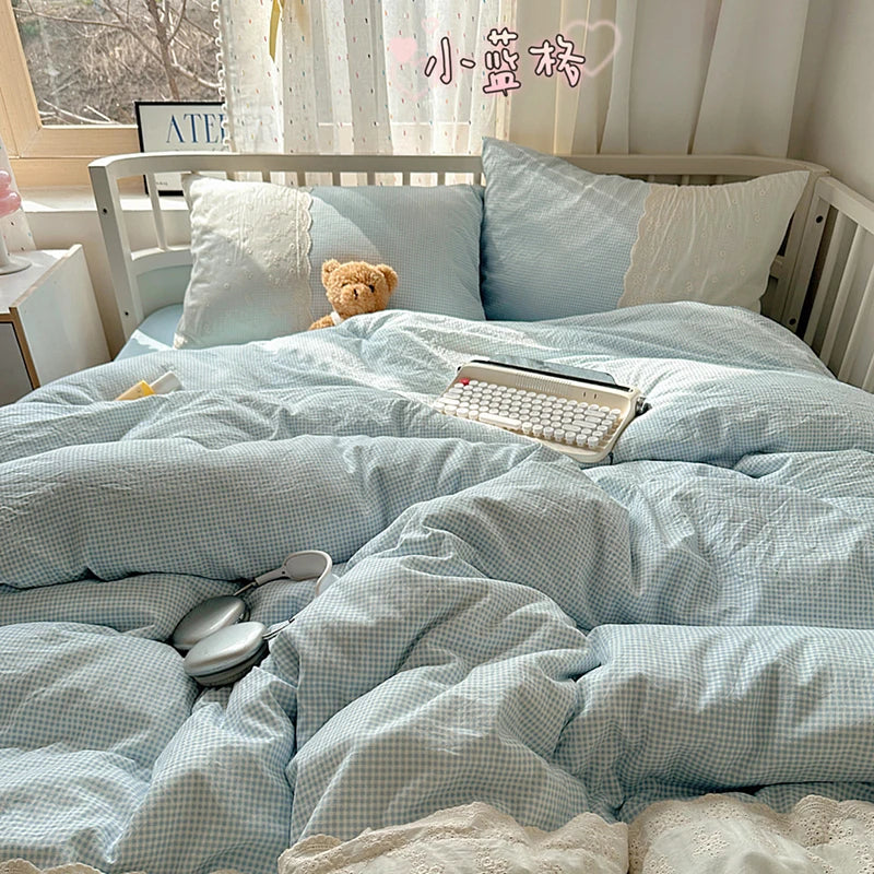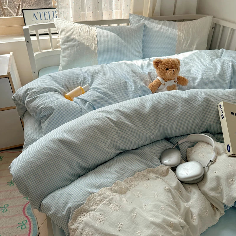 Plaid Pattern Bedding Set INS Princess Soft Washed Cotton Bed Flat Sheet Twin Queen Double Size Duvet Set Pillowcase Bed Linens