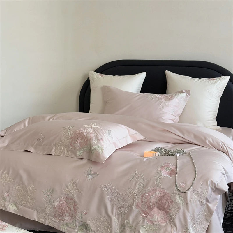 Premium 600TC Egyptian Cotton Luxury Flowers Butterfly Embroidery Pink Bedding Set Duvet Cover Flat/Fitted Sheet Pillowcase 4Pcs