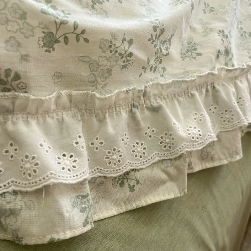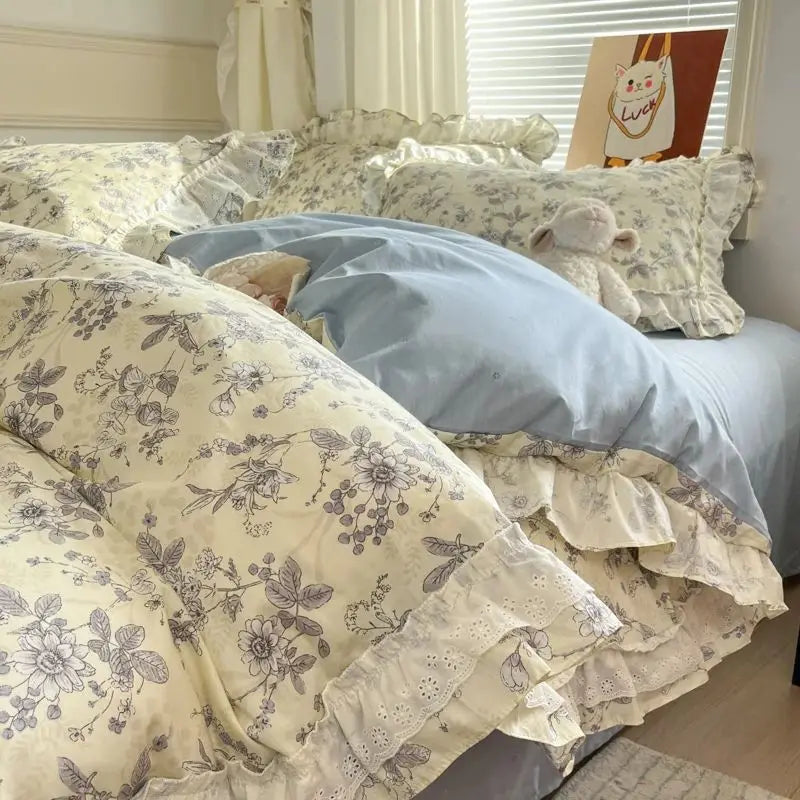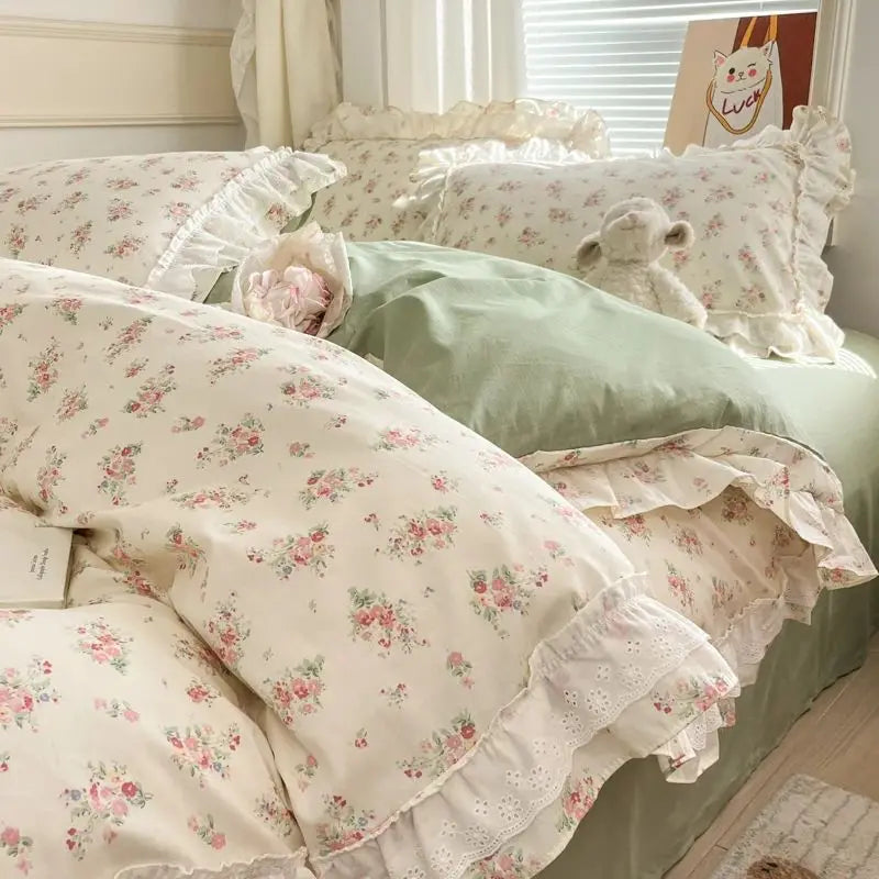 Princess Style Lace Ruffles 100% Cotton Bedding Set Floral Pastoral Style Duvet Cover Flat/Fitted Bed Sheet Pillowcases 3/4Pcs