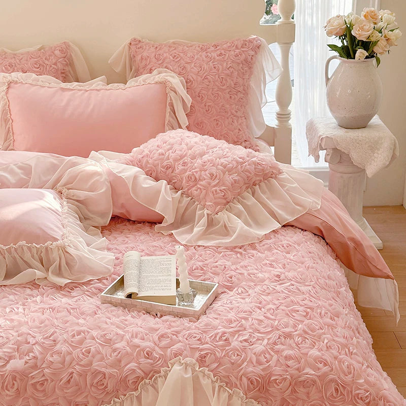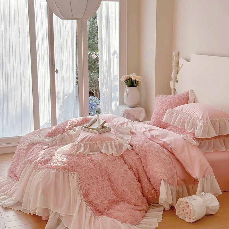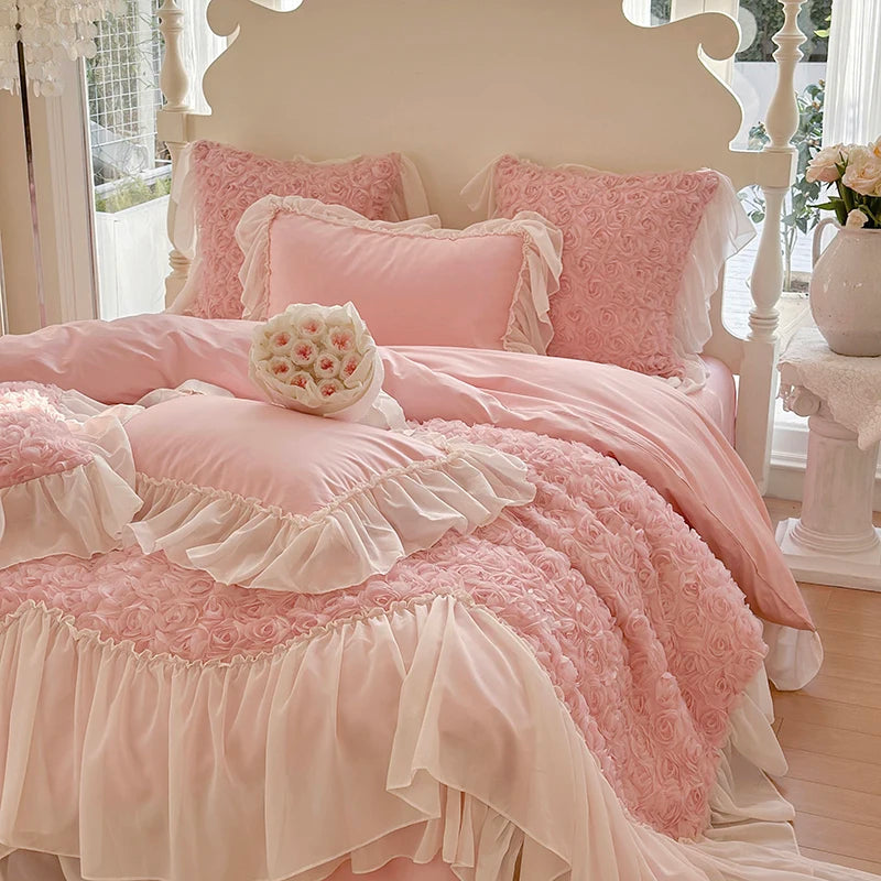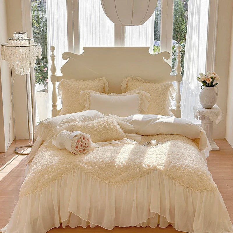 Two-thirds Rose Flowers Lace Princess Wedding Bedding Set 1200TC Egyptian Cotton Duvet Cover Flat/Fitted Bed Sheet Pillowcases