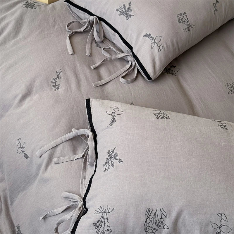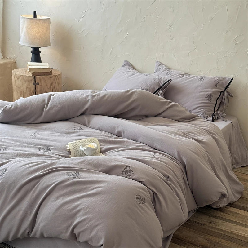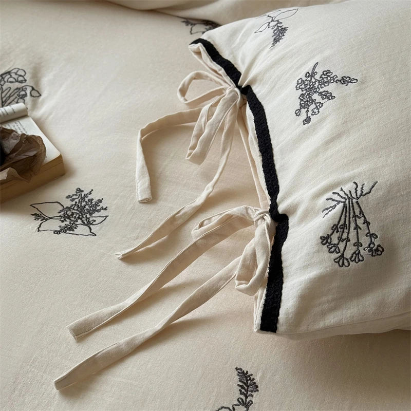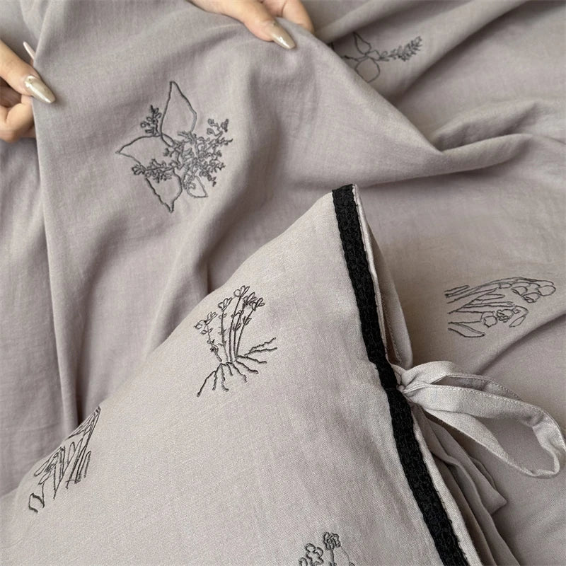 100% Cotton Wrinkled Yarn Flower Embroidery Bedding Set Single Queen King Size Duvet Cover Flat/Fitted Sheet Lace-Up Pillowcases