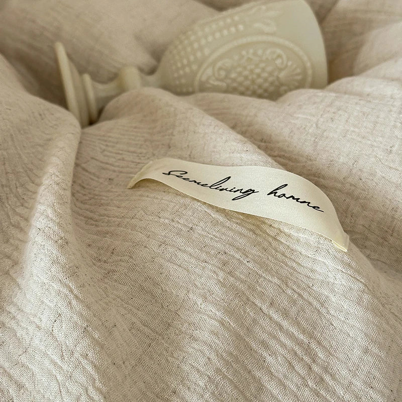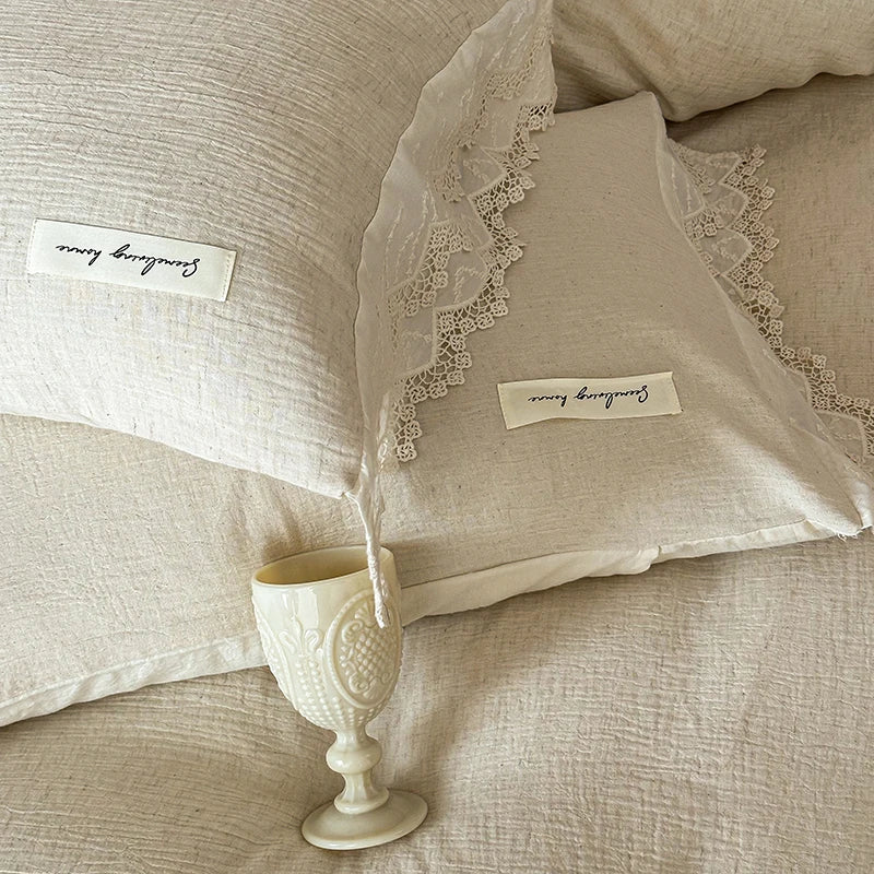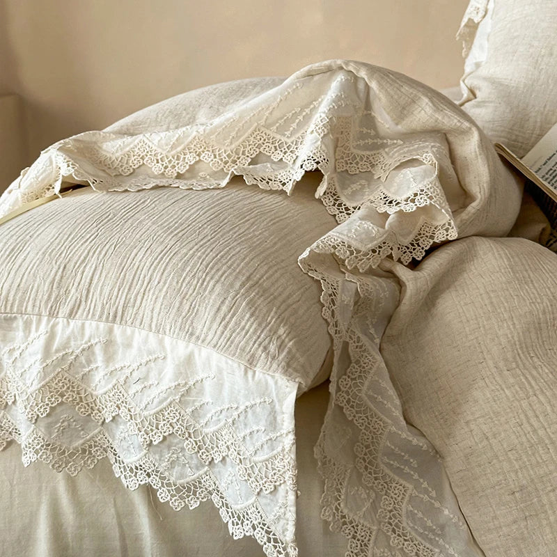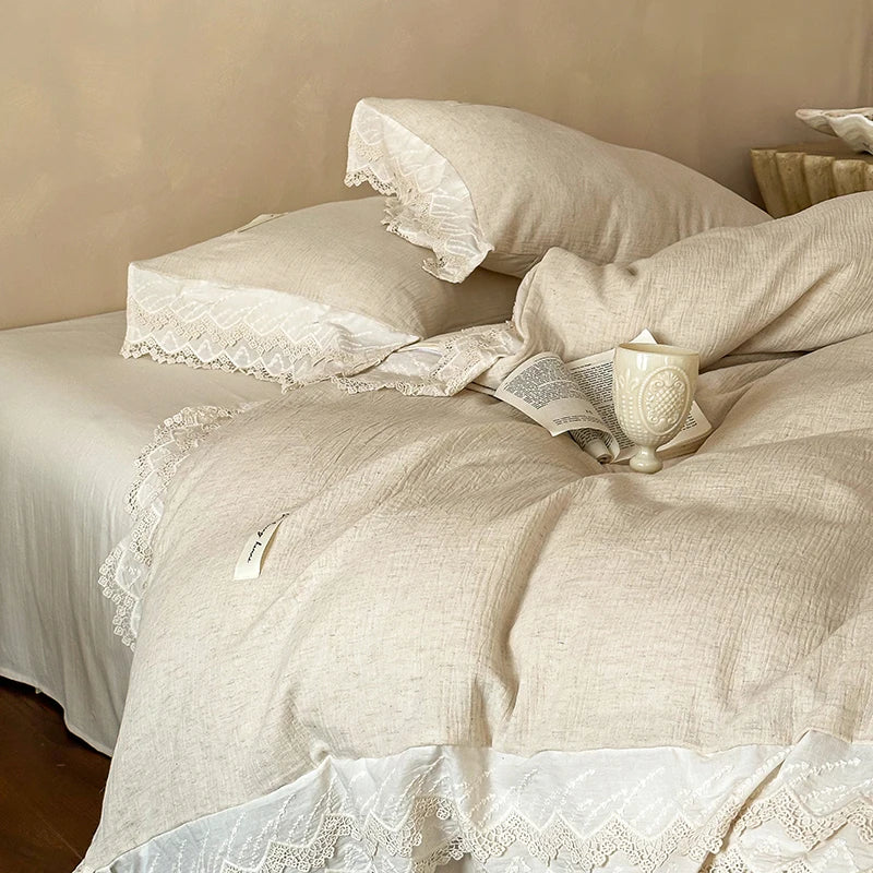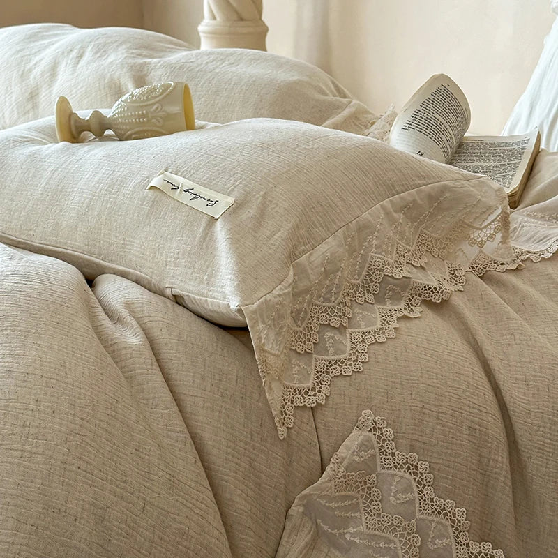 20% Linen And 80% Cotton Vintage French Lace Edge Embroidery Bedding Set Duvet Cover Set Bed Sheet/Fitted Sheet Pillowcases 4Pcs