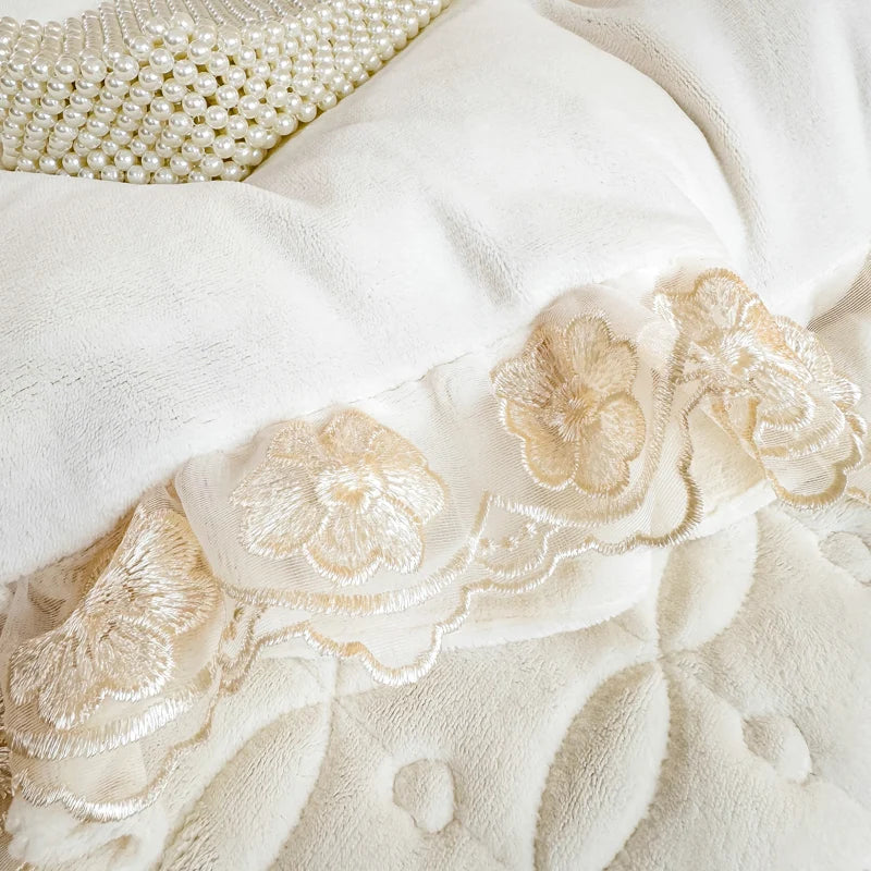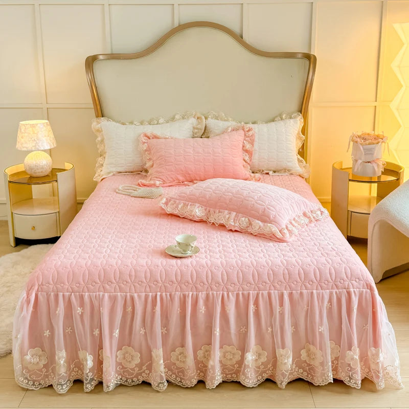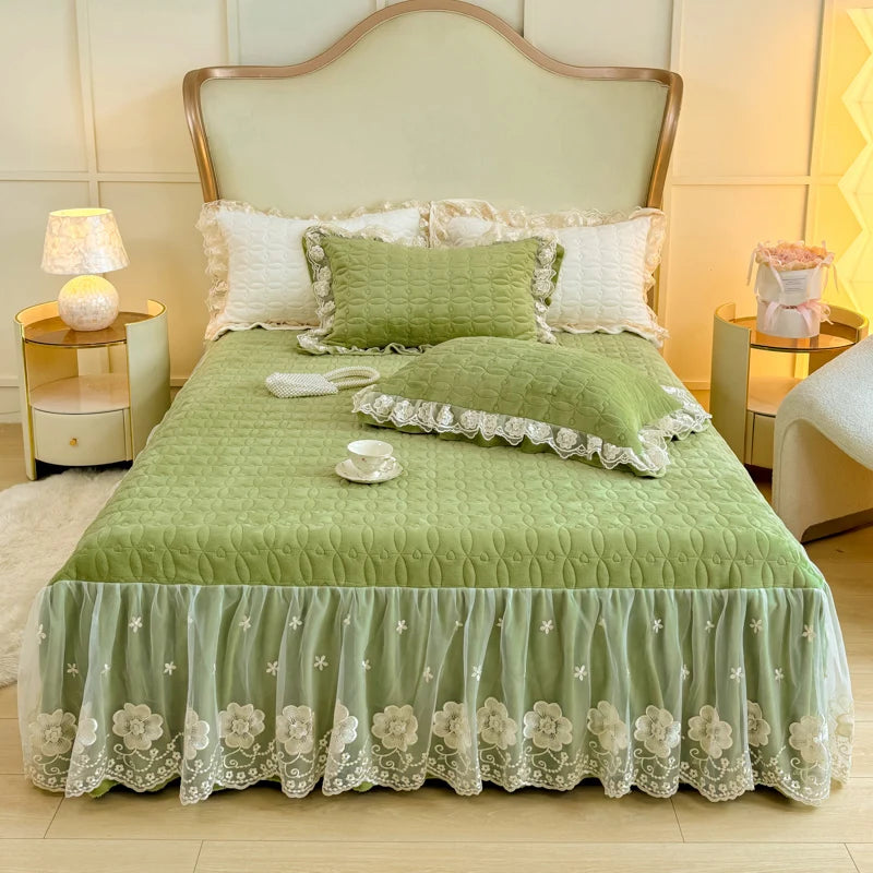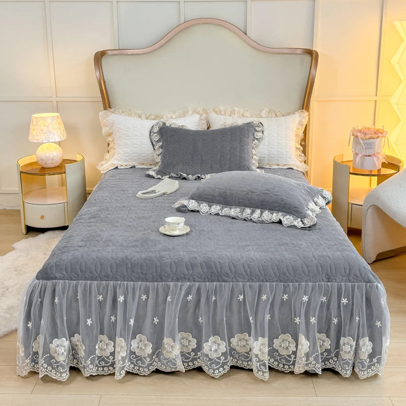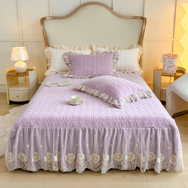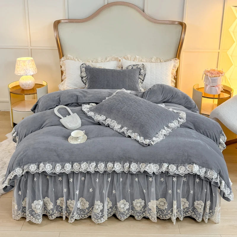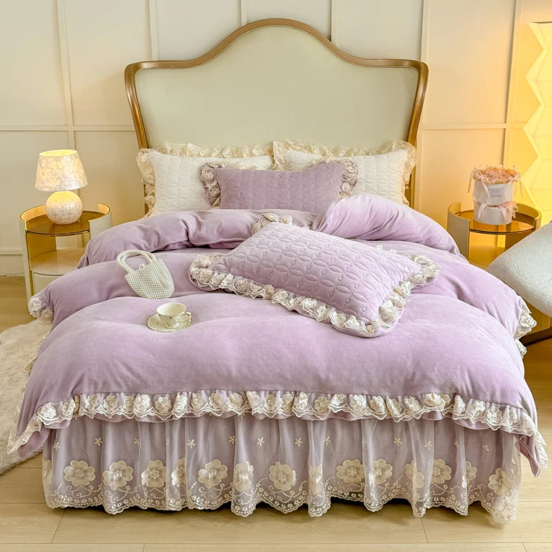 3/4Pcs Warm Milk Velvet Bedding Set Luxury Princess Flowers Lace Edge Duvet Cover Bed Skirt Bedspread Pillowcase Home Textile