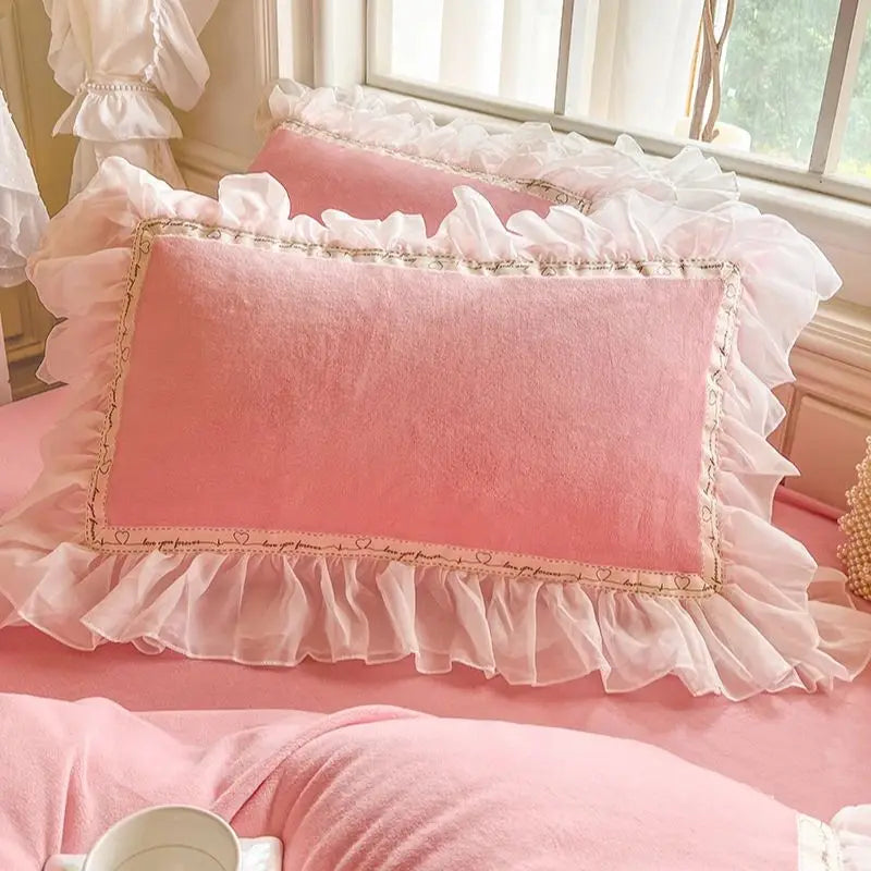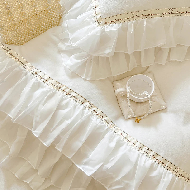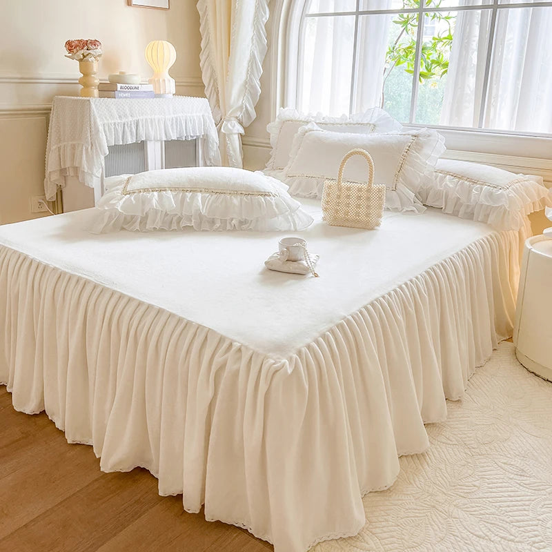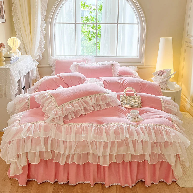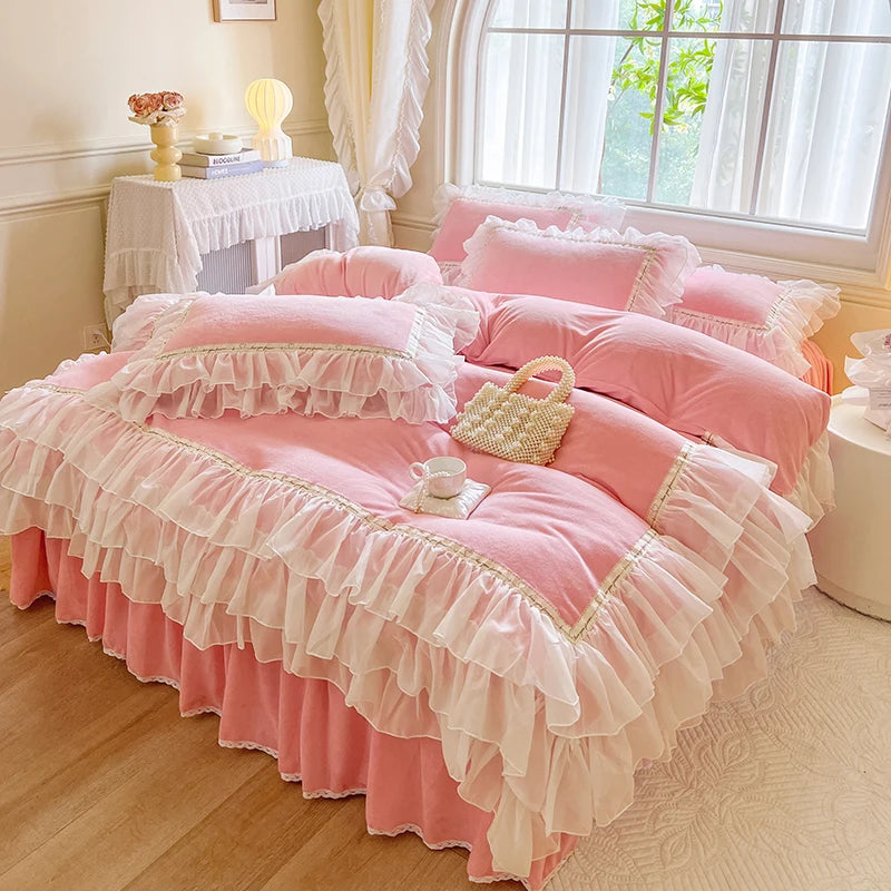 4Pcs Korean Princess Style Winter Thick Warm Milk Velvet Bedding Set Three-layer Lace Ruffles Duver Cover Bed Skirt Pillowcases