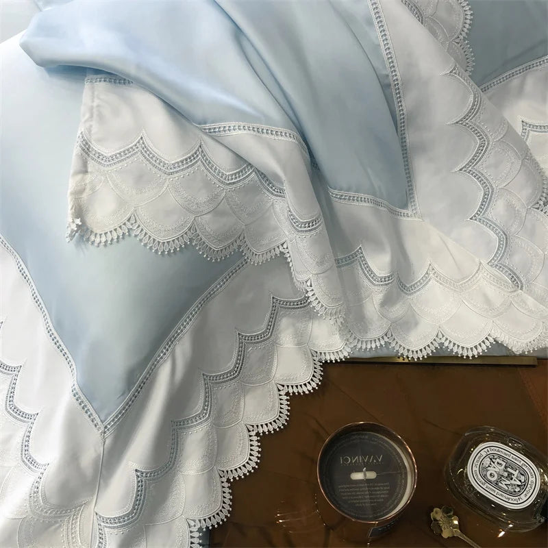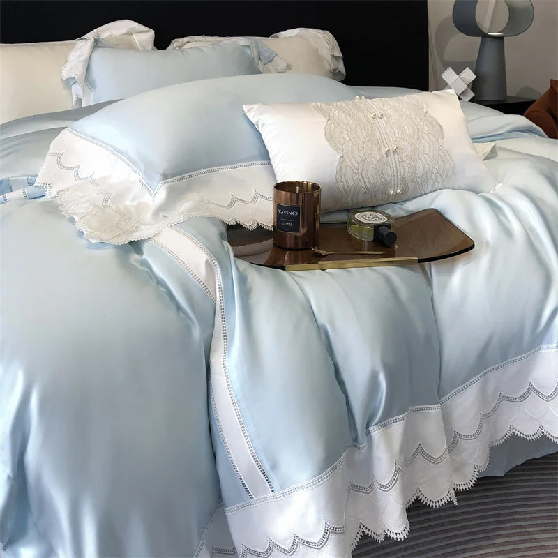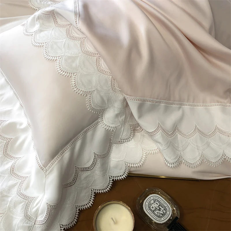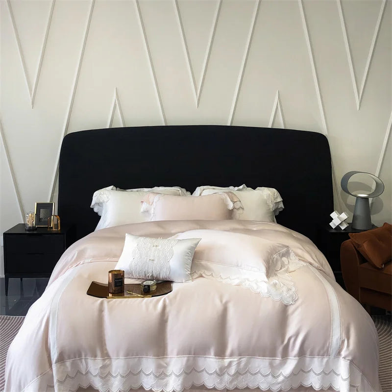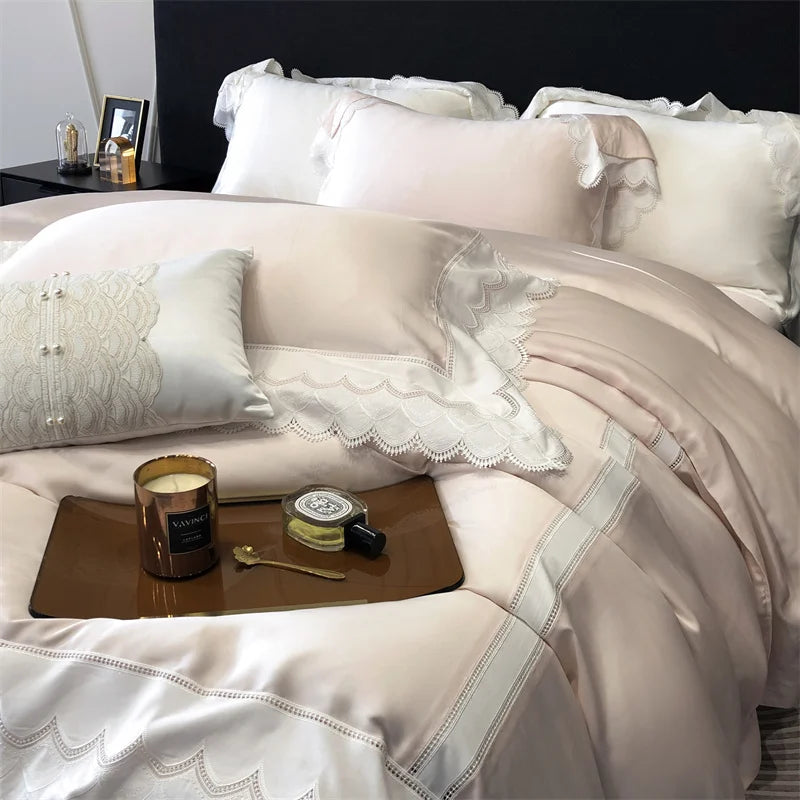 4Pcs Pink Princess Lace Edge Lyocell Eucalyptus Fiber Soft Silky Bedding Set Duvet Cover Set Bed Sheet/Fitted Sheet Pillowcases