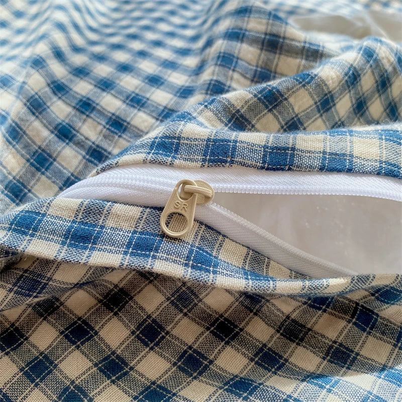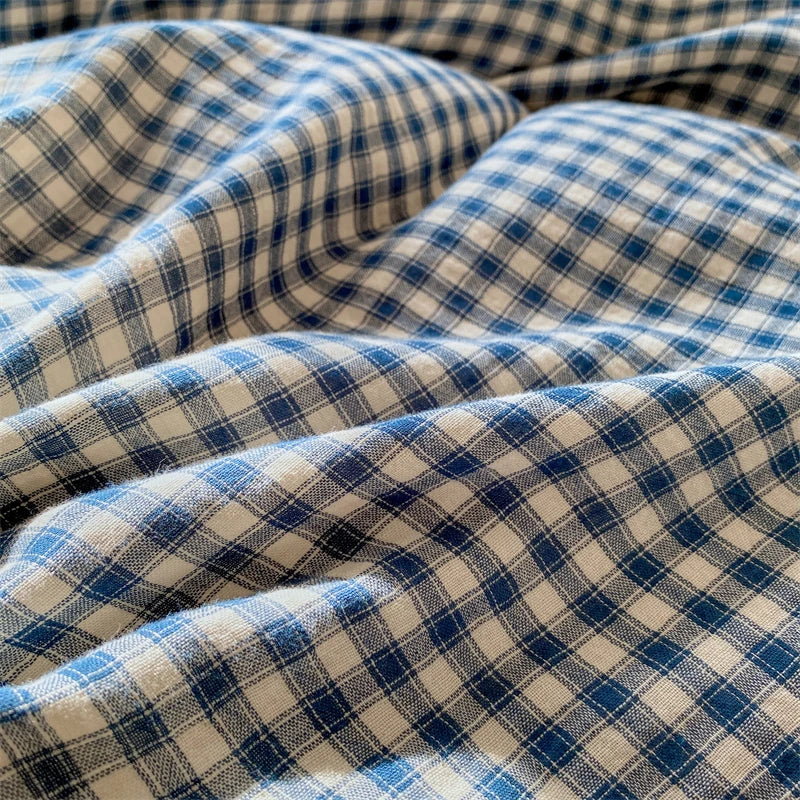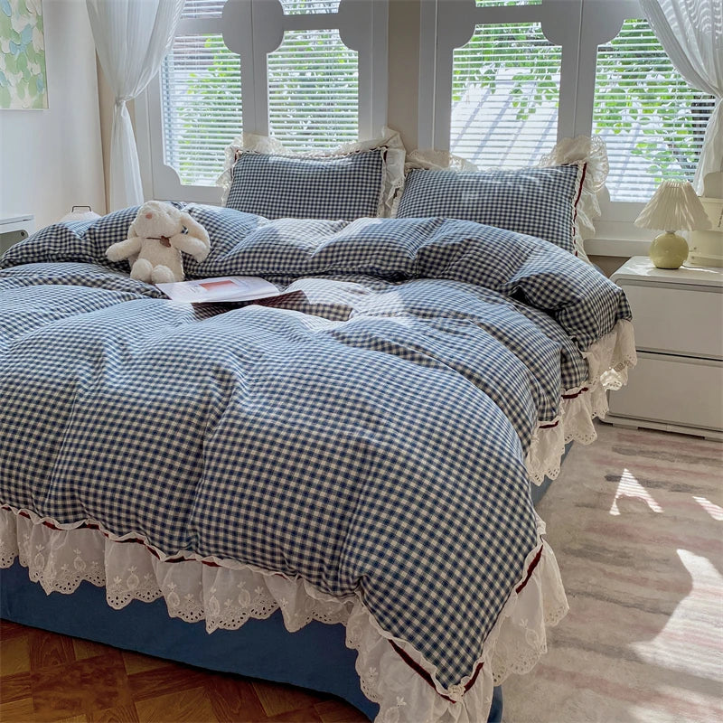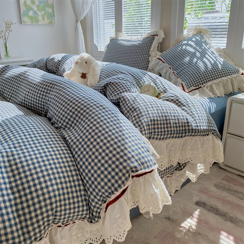 Blue Plaid Lace Ruffles Bedding Set 100% Cotton Double Layer Thread Wrinkled Yarn Duvet Cover Flat/Fitted Bed Sheet Pillowcases