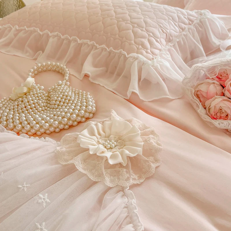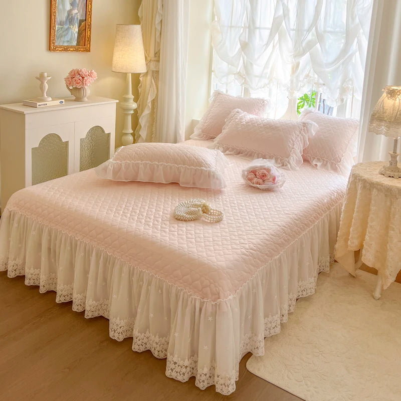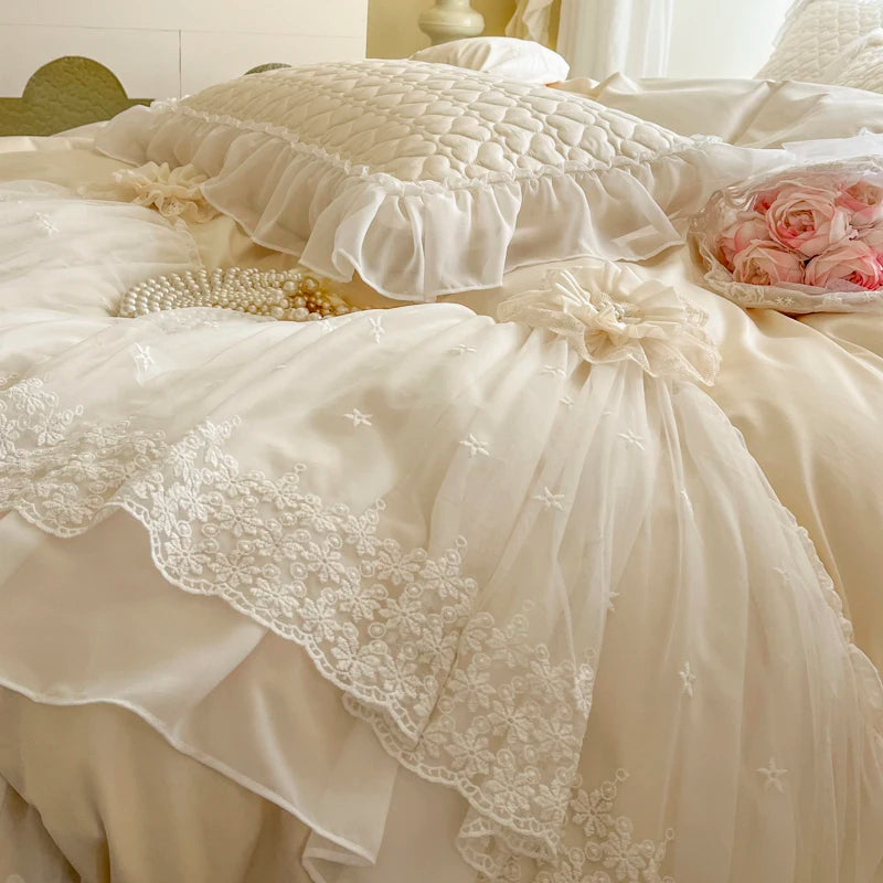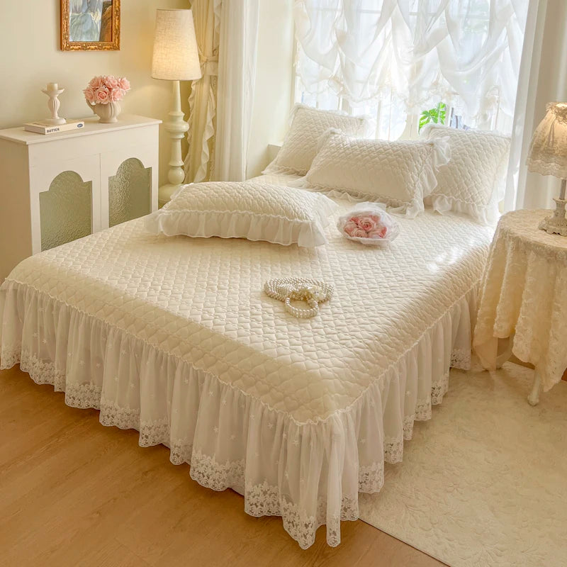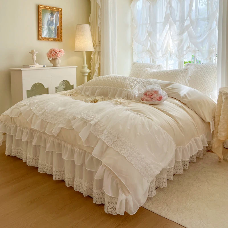 Double Layer Lace Ruffles Princess Wedding Bedding Set 100S Egyptian Cotton Duvet Cover Quilted Bedspread Bed Skirt Pillowcases
