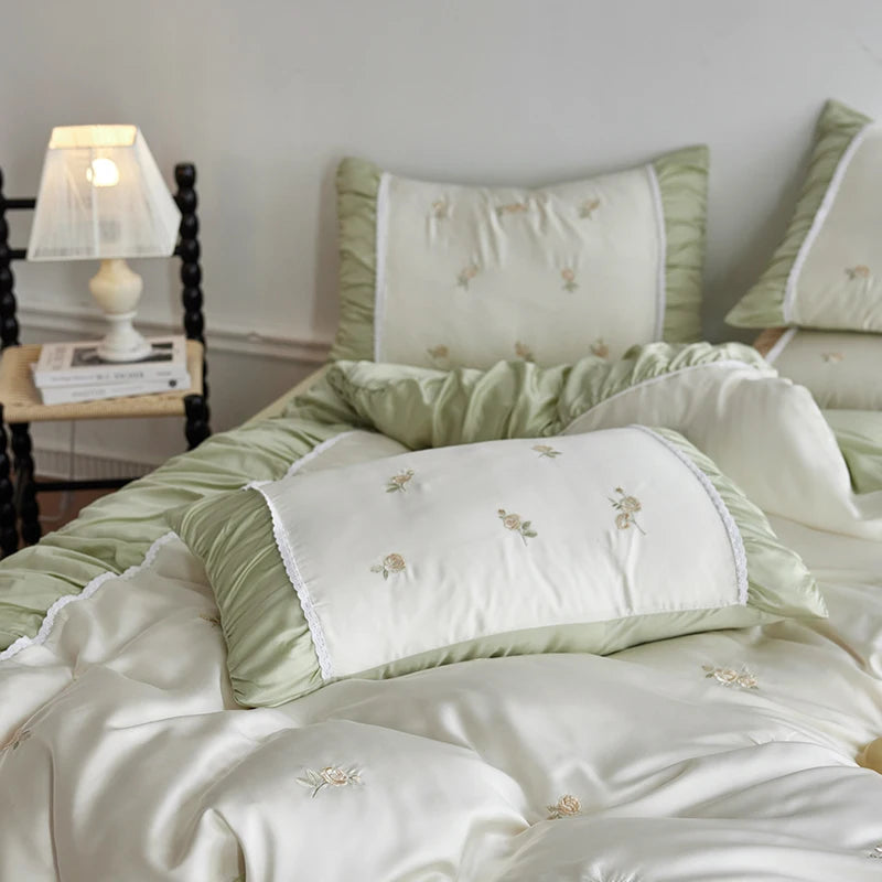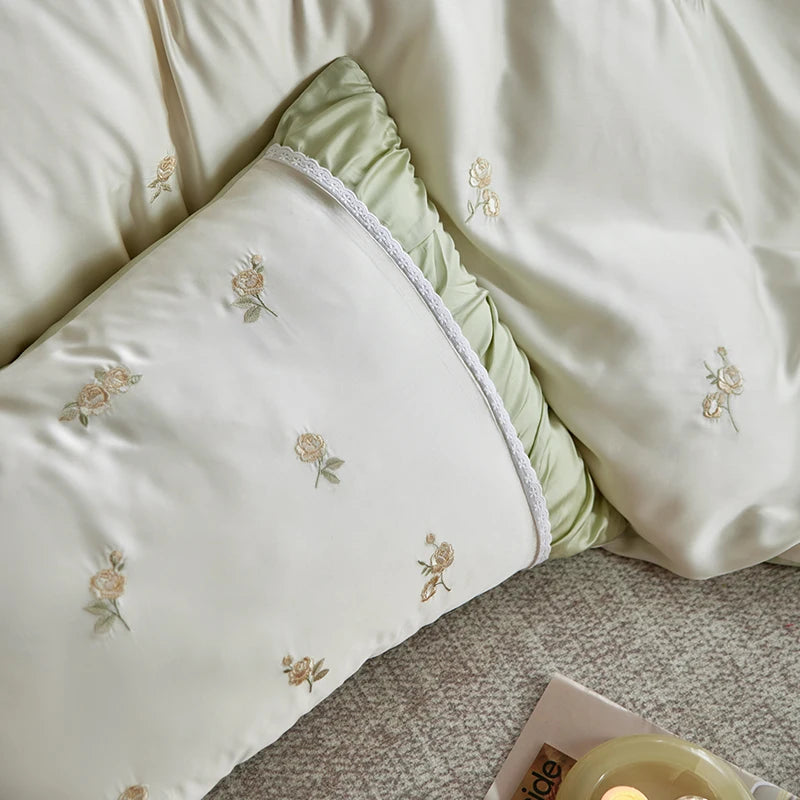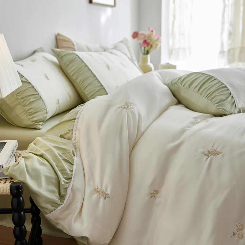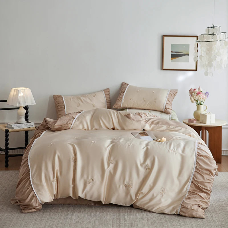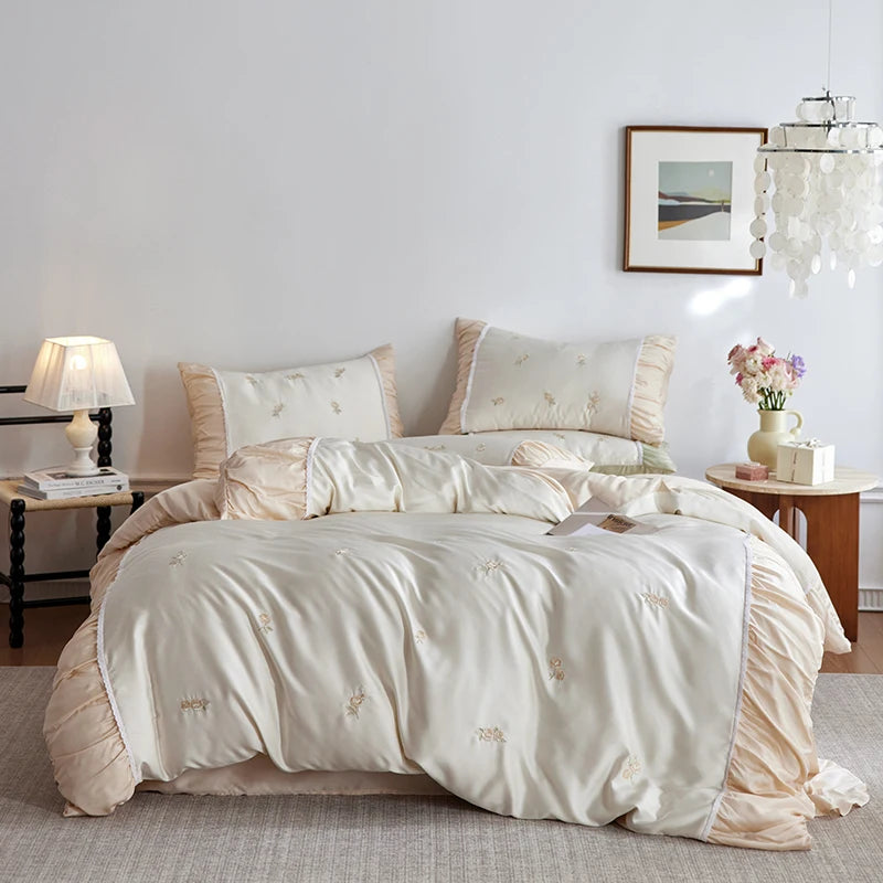 Flowers Embroidery Pleated Wide Edge Bedding Set Lyocell Soft Silky Cooling Duvet Cover Flat/Fitted Bed Sheet Pillowcases 4Pcs