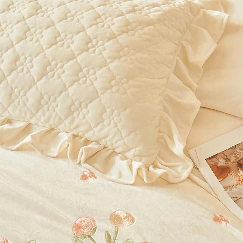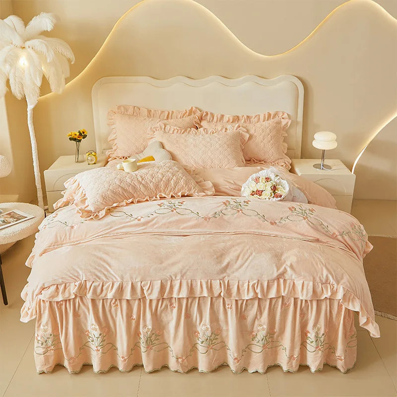 Luxury Winter Thickened Velvet Rose Flowers Embroidery Bedding Set Ruffles Duvet Cover, Quilted Bedspread, Bed Skirt, Pillowcase