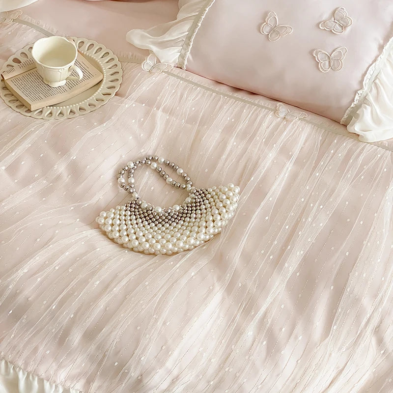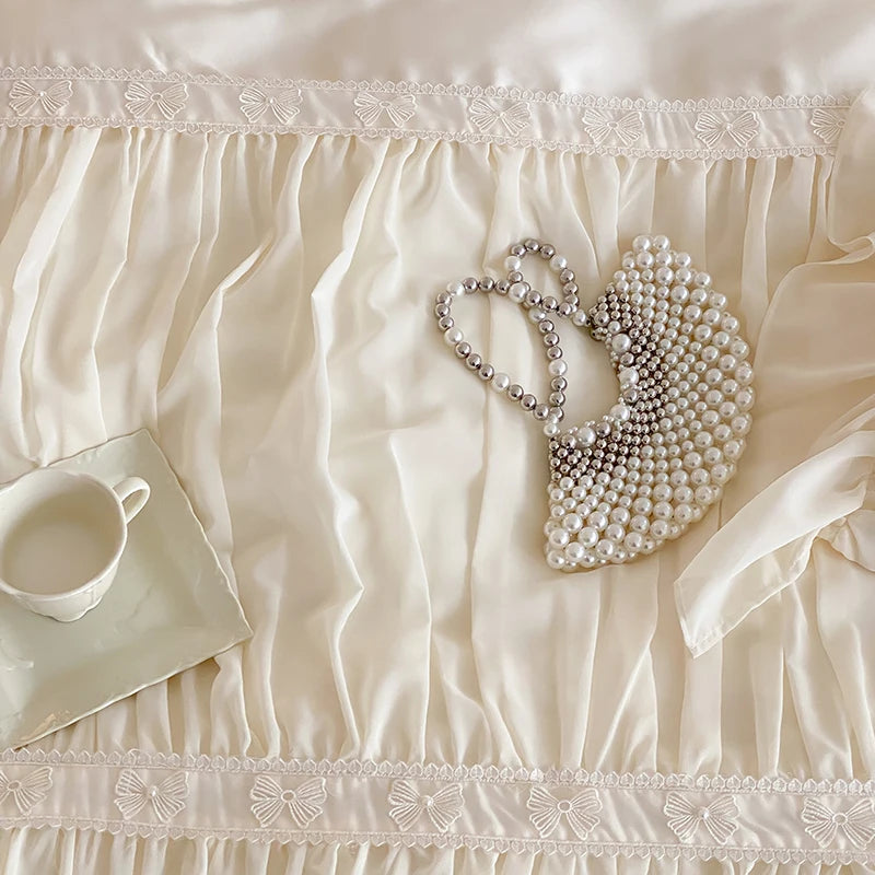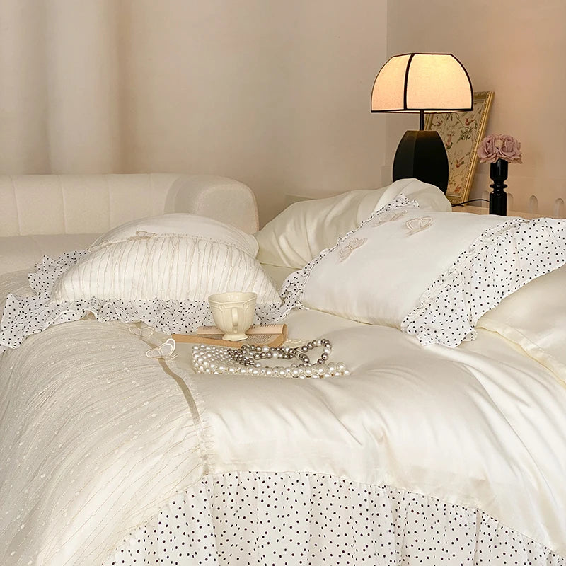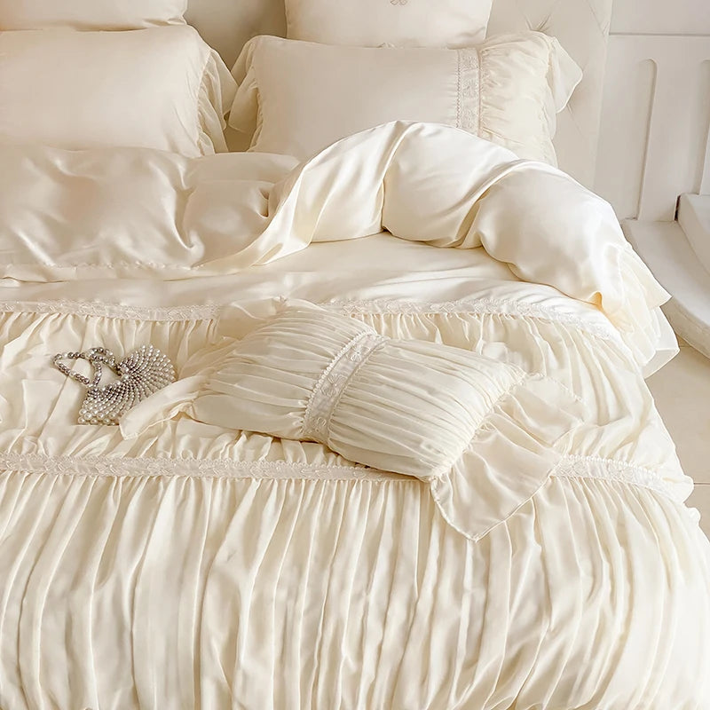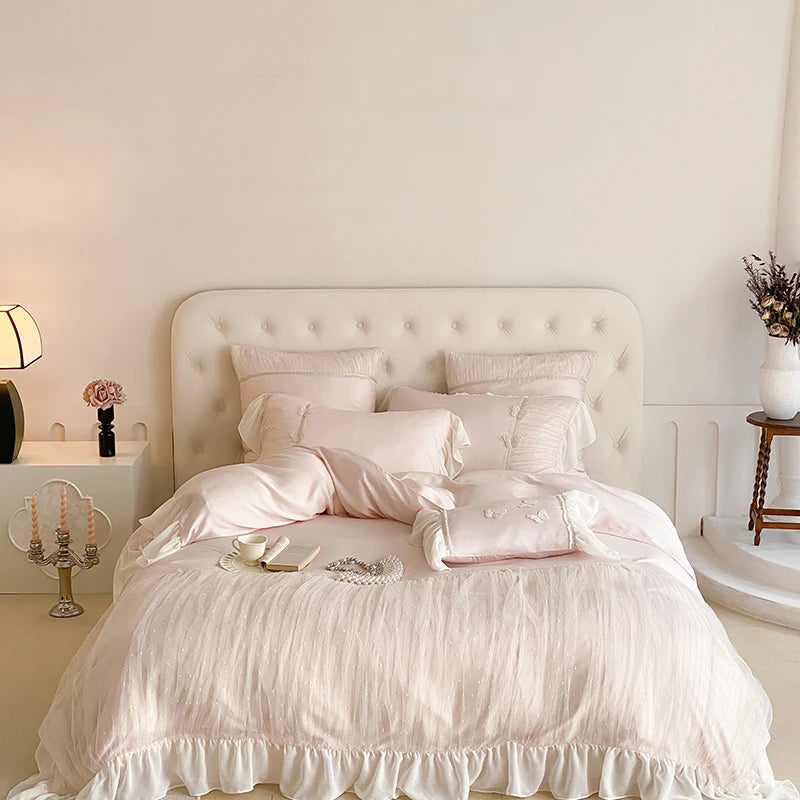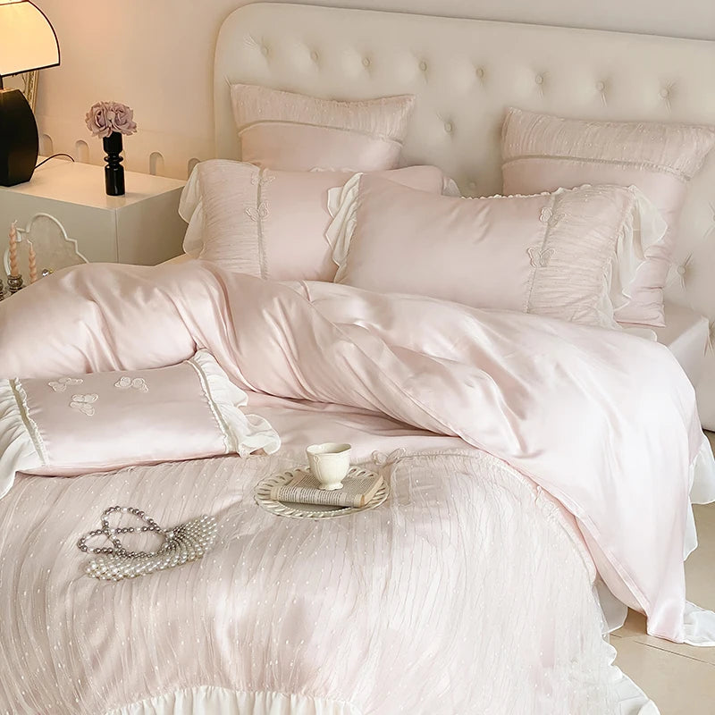 Pink Romantic Lace Princess Wedding Bedding Set Lyocell Bamboo Fiber Soft Silky Duvet Cover Flat/Fitted Bed Sheet Pillowcases
