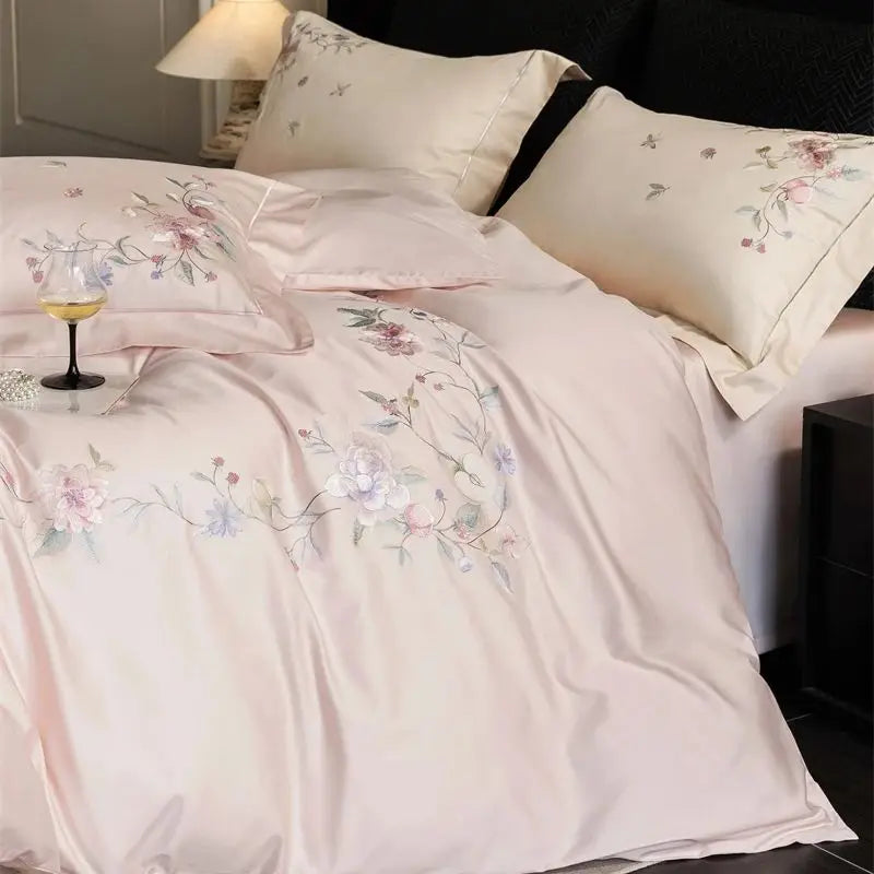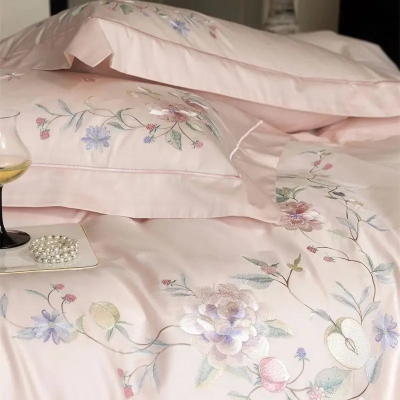 Premium 1000TC Egyptian Cotton Flowers Embroidery Pink Luxury Bedding Set Duv