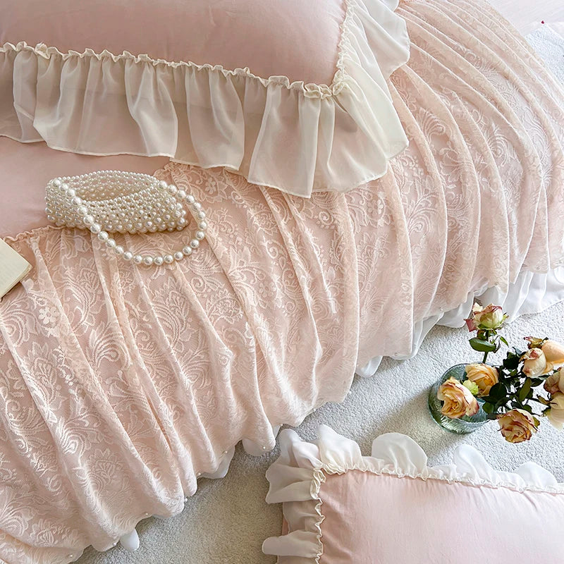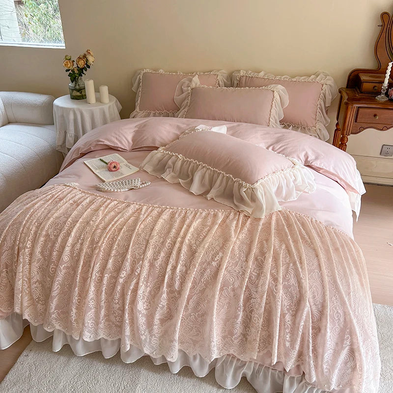Pure Cotton Lace Ruffles Princess Wedding Style Bedding Set Queen King Size Duvet Cover Set Bed Sheet Pillowcases 4Pcs