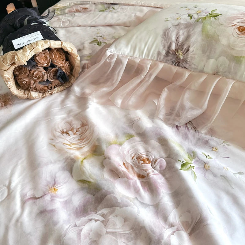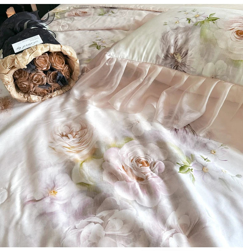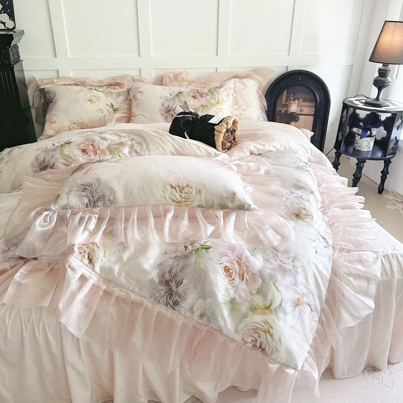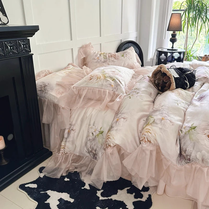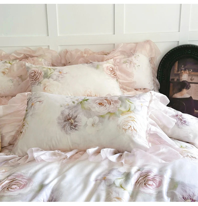 Rose Flower Print Bedding Set Luxury Lyocell Cotton Chiffon Lace Ruffles Duvet Cover Bed Sheet/Bed Skirt/Fitted Sheet Pillowcase