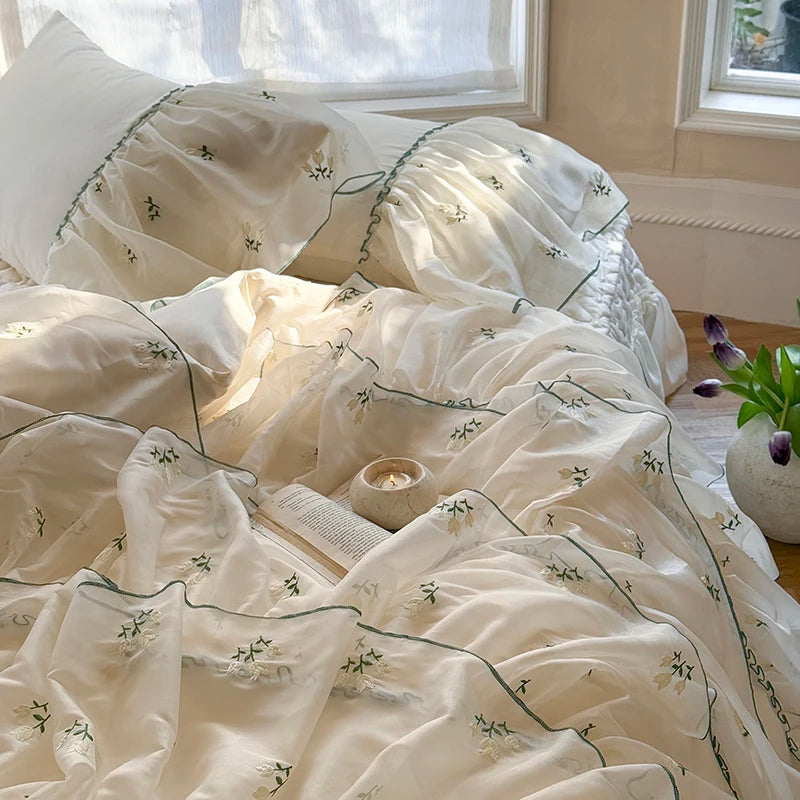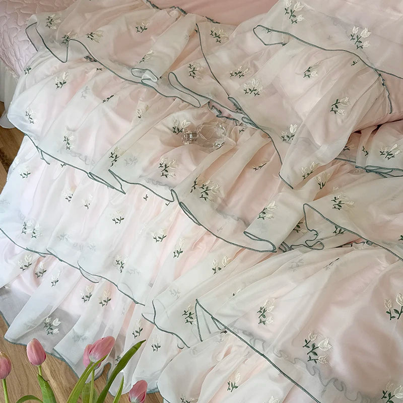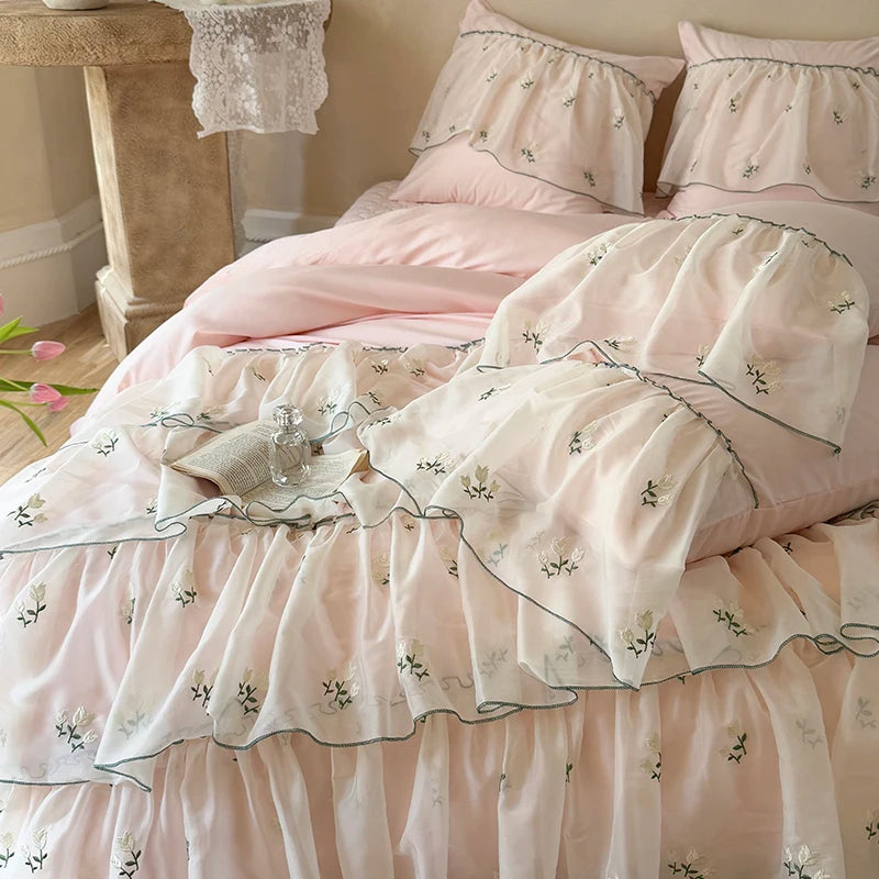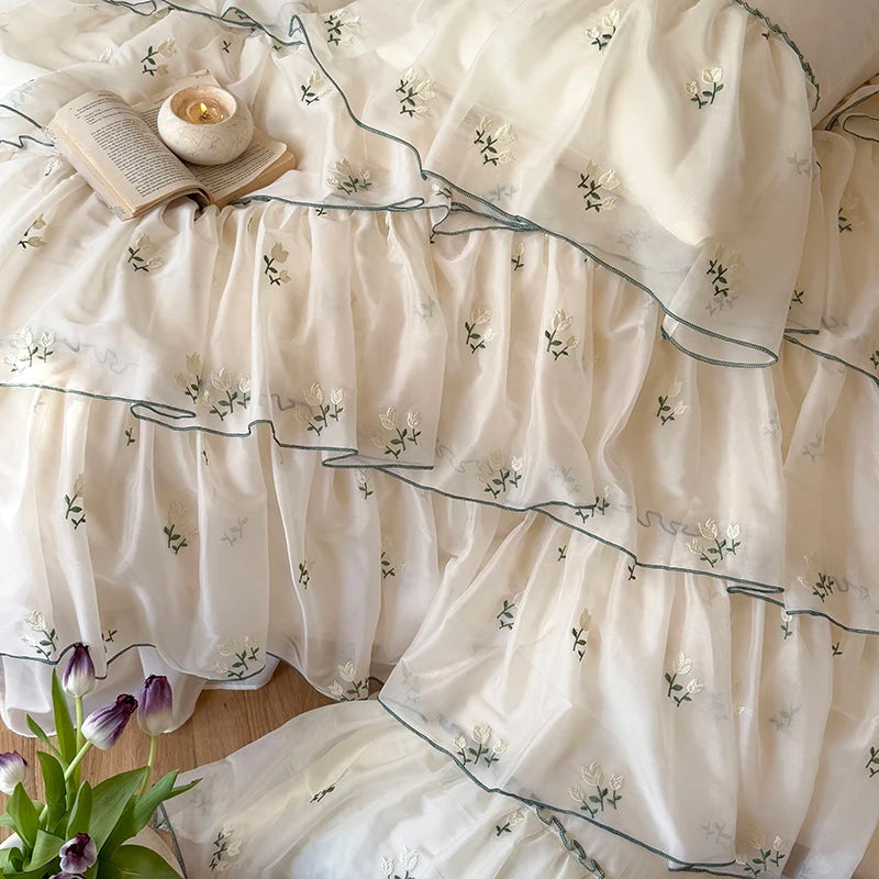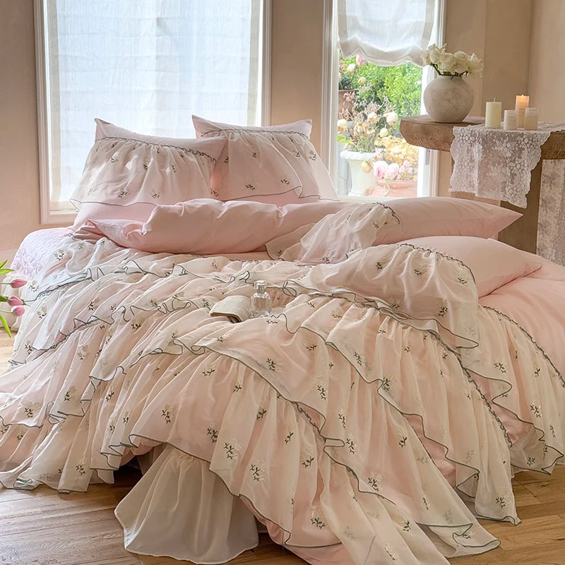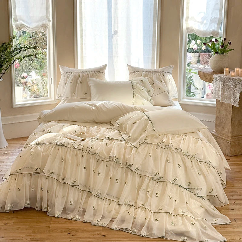 Three-layer Floral Embroidered Lace Ruffles 1000TC Egyptian Cotton Bedding Set Duvet Cover Flat/Fitted Bed Sheet Pillowcase 4Pcs