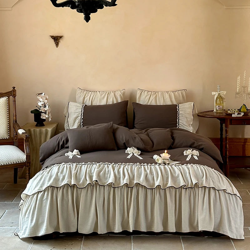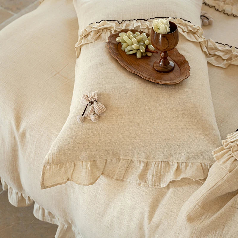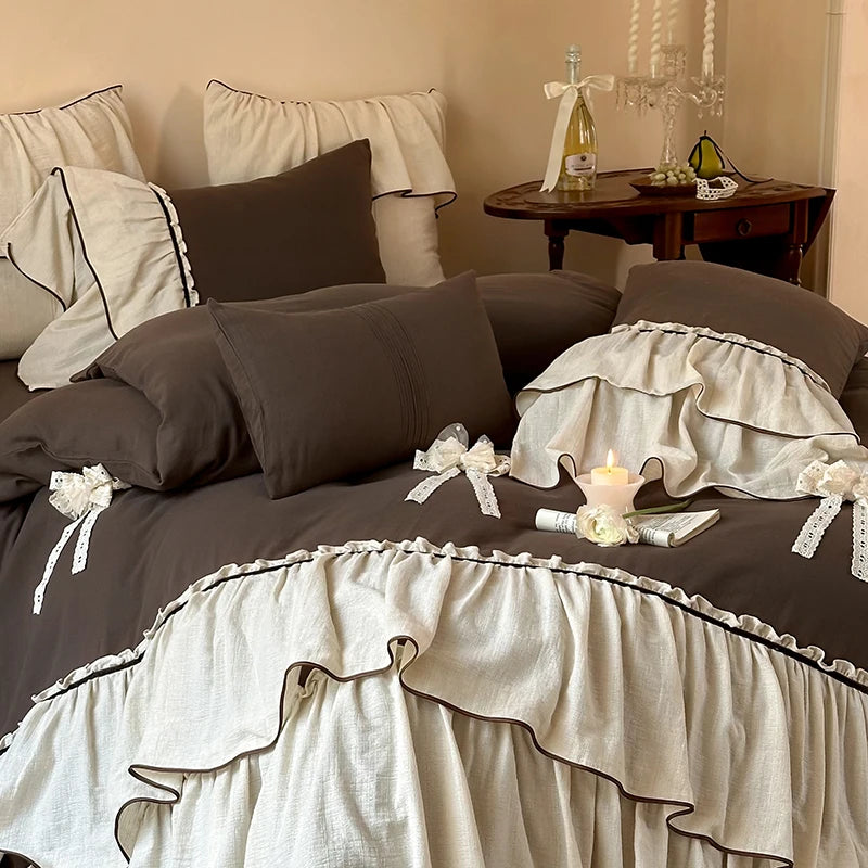Vintage Double Layer Bow Princess Bedding Set 20% Linen And 80% Cotton Duvet Cover Set Flat/Fitted Bed Sheet Pillowcases 4Pcs