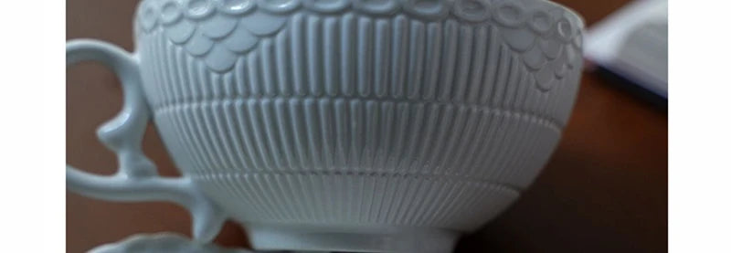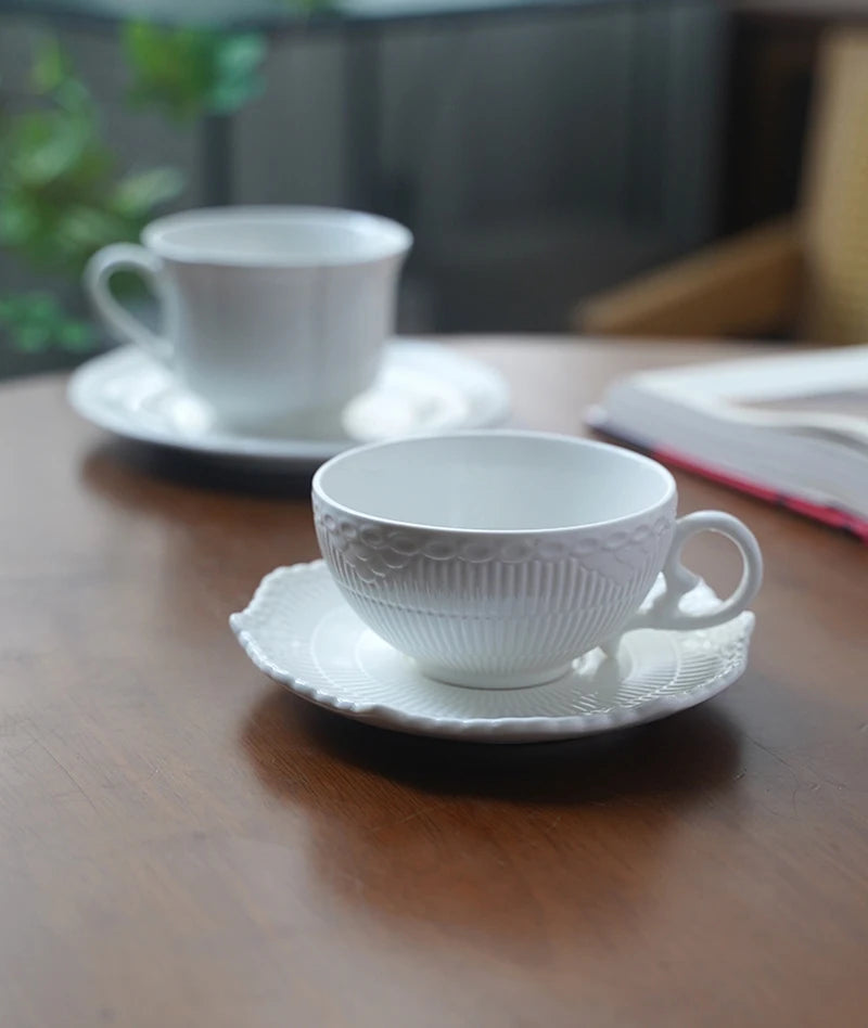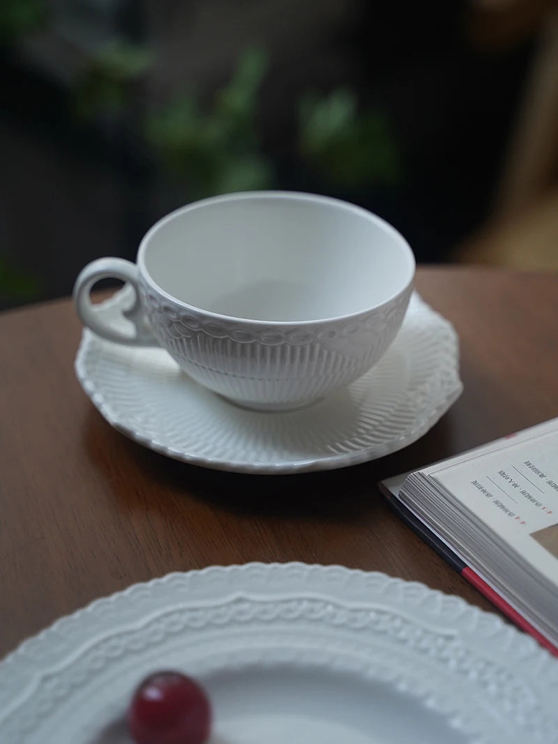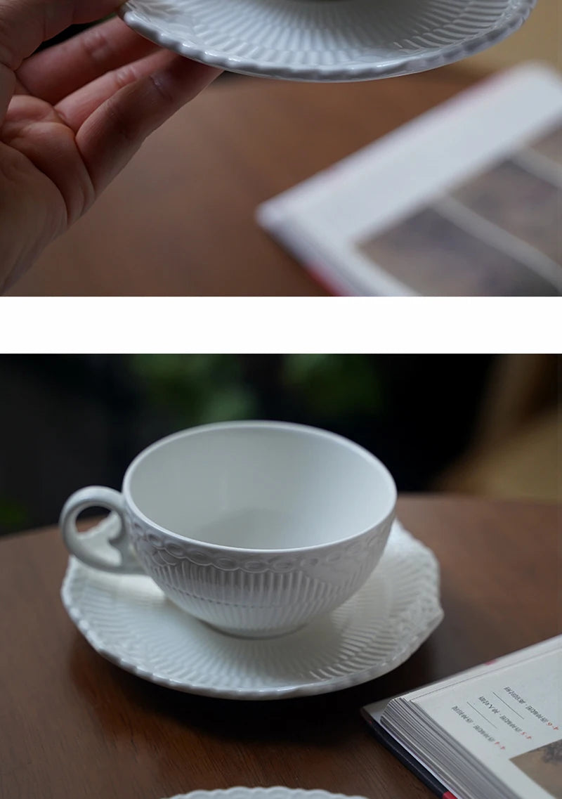 Ins Ceramic Handgrip Coffee Cup Exquisite Afternoon Tea Cup Dish 2Pcs Set French Style Household White Relief Drinkware