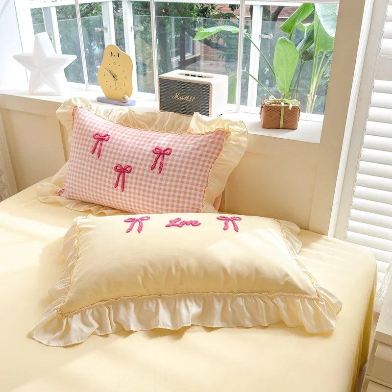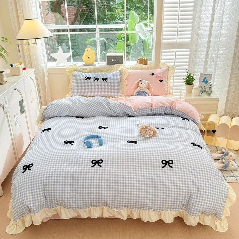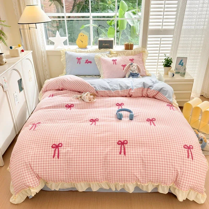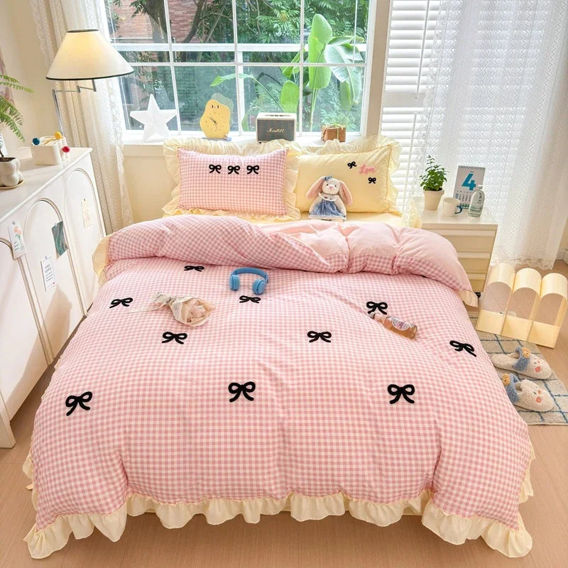 Classic Plaid Duvet Cover, Soft Lace Bedding Set, Bow Design Skin-friendly Quilt Cover, 2 Pillowcases with Different Patterns