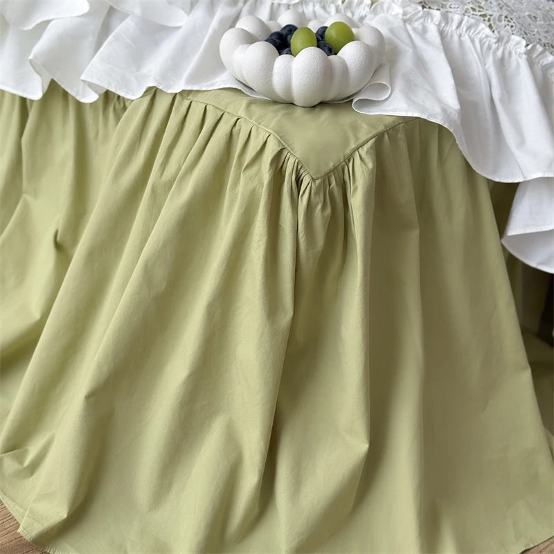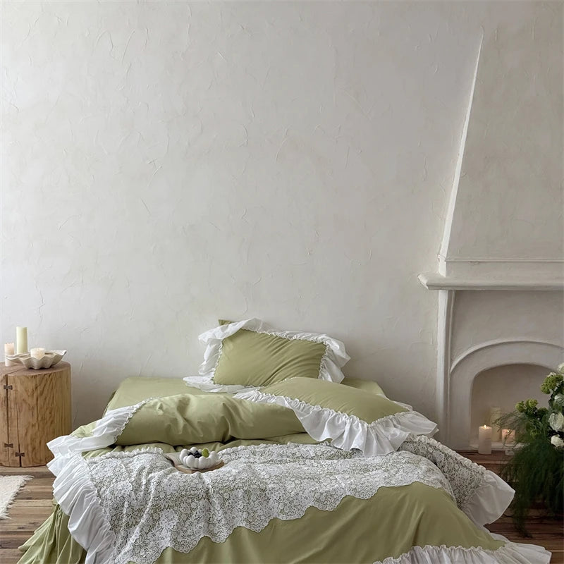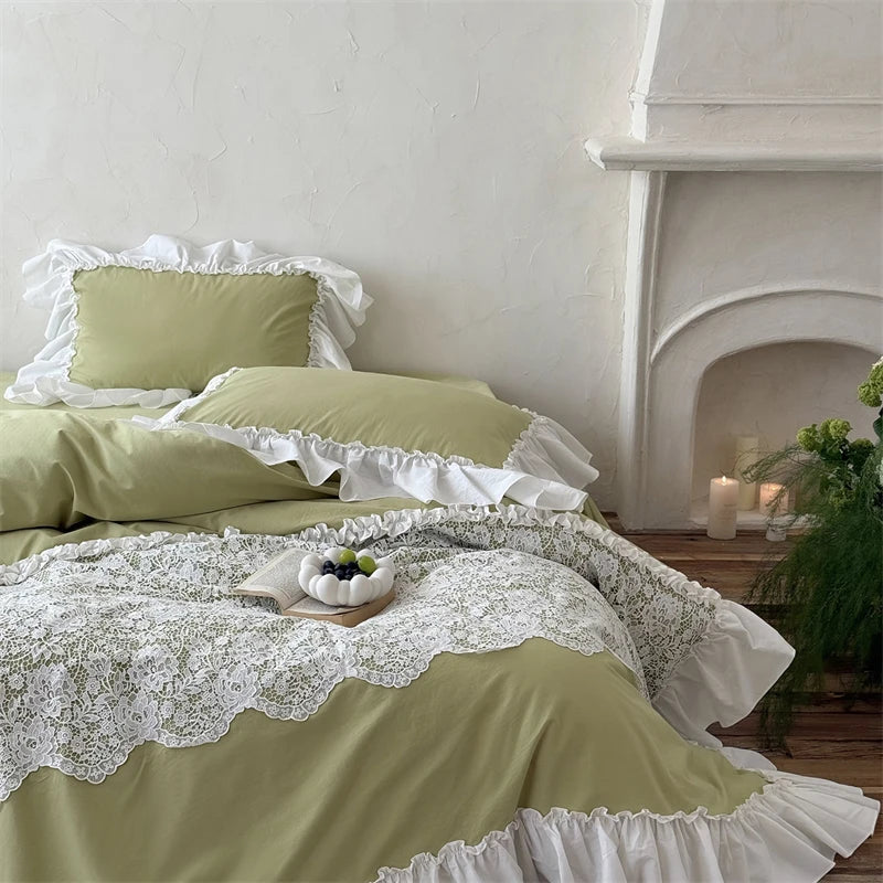 French Romantic 100% Cotton Washed Cotton Bedding Set White Flowers Lace Ruffles Duvet Cover Bed Skirt Pillowcases 4Pcs