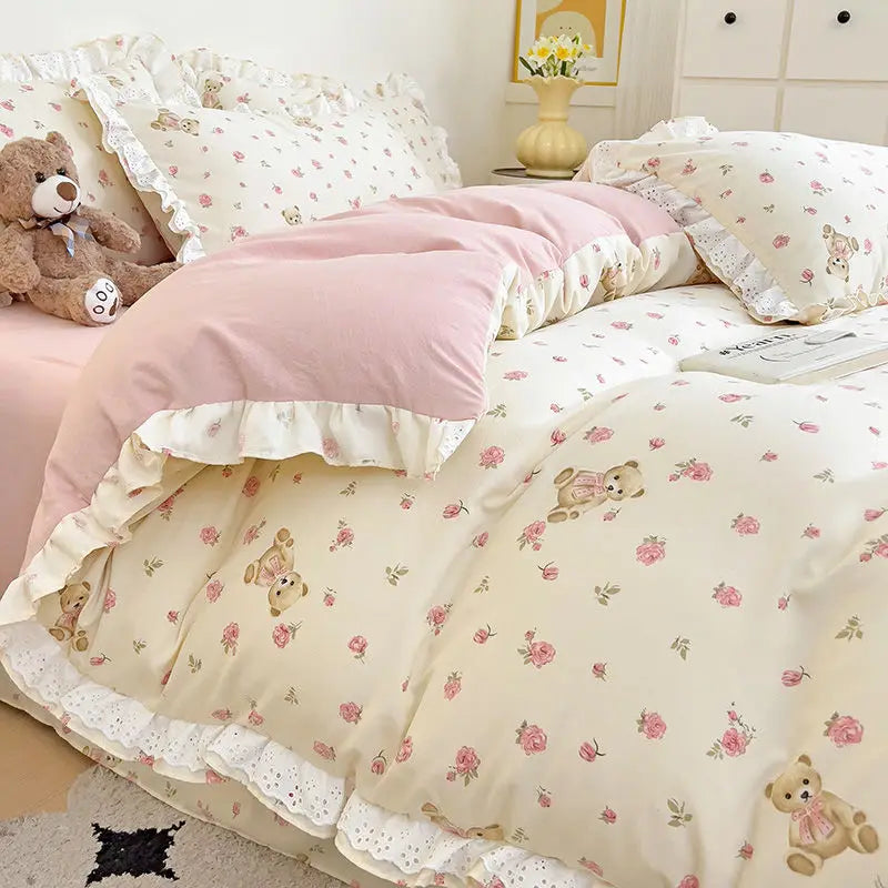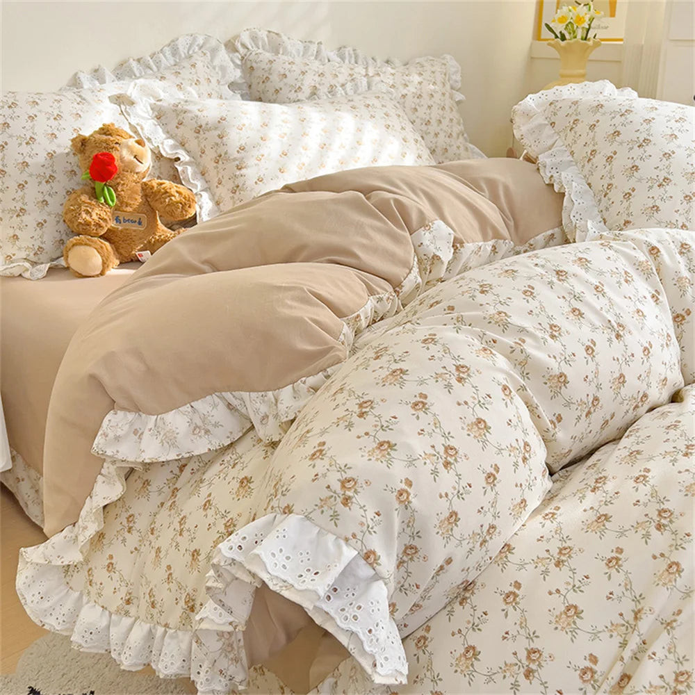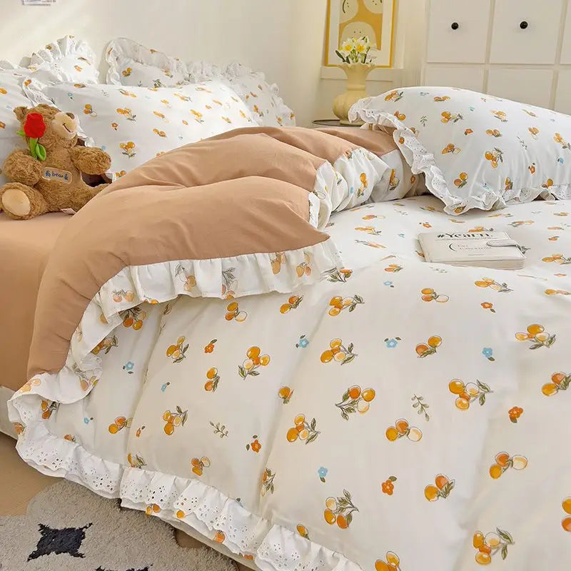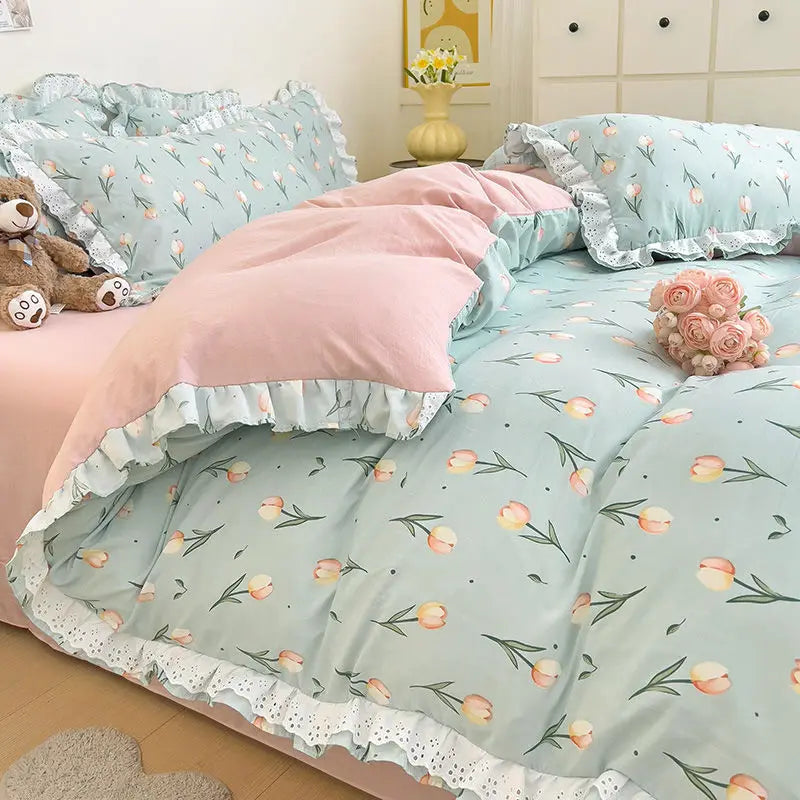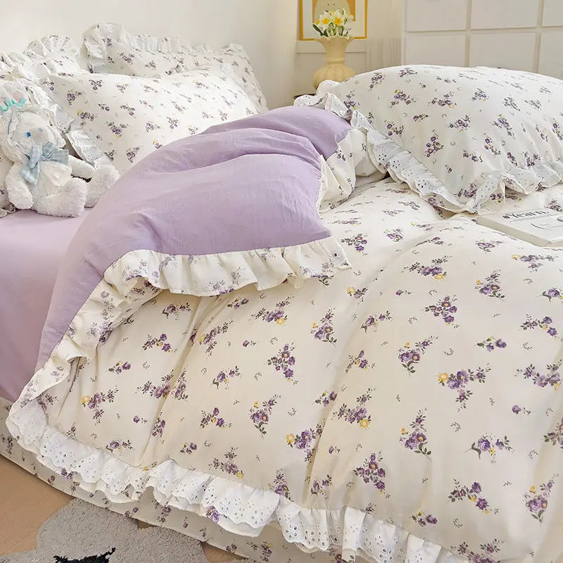 Princess Style Lace Ruffles Bedding Set Purple Tulips Duvet Cover and Flat Sheet Pillowcases Girls Romantic Floral Home Textiles
