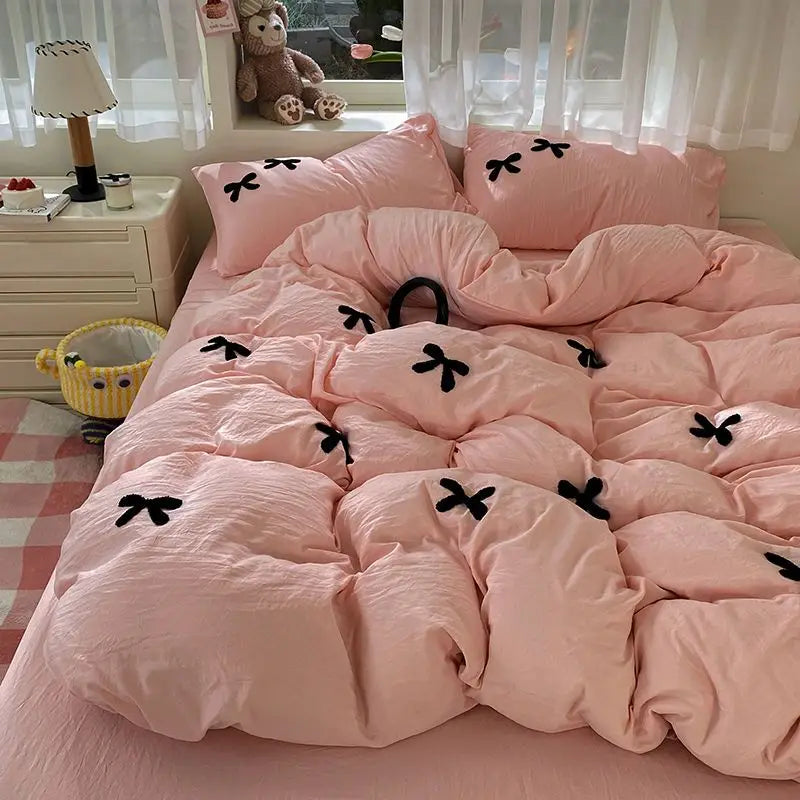 Skin Friendly Washed Cotton Bow Towel Embroidered Duvet Cover Set NO Filler Girls Princess Home Bedding Flat Sheet Pillowcase