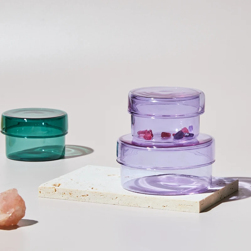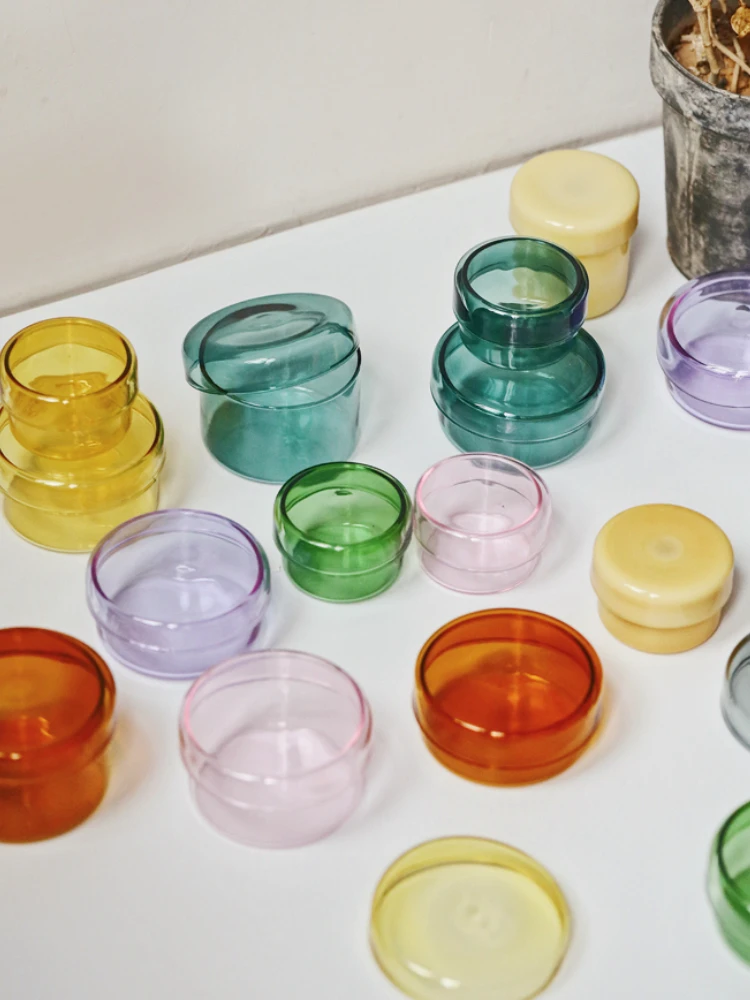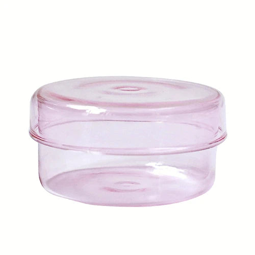 Crafted in borosilicate glass with lid, it can be used for display or storage in most rooms in the house.